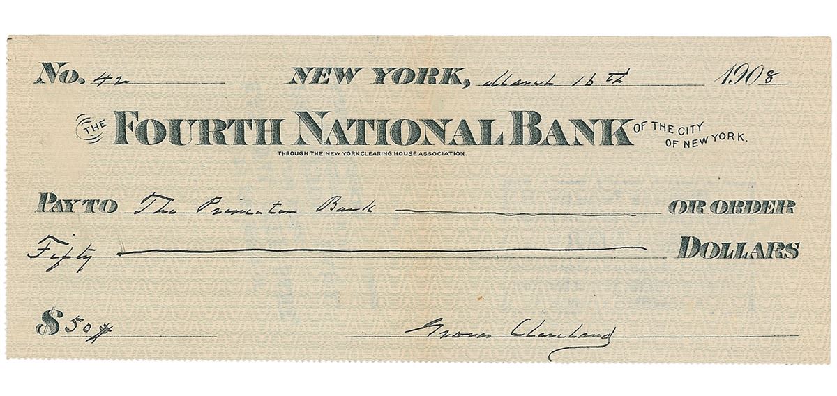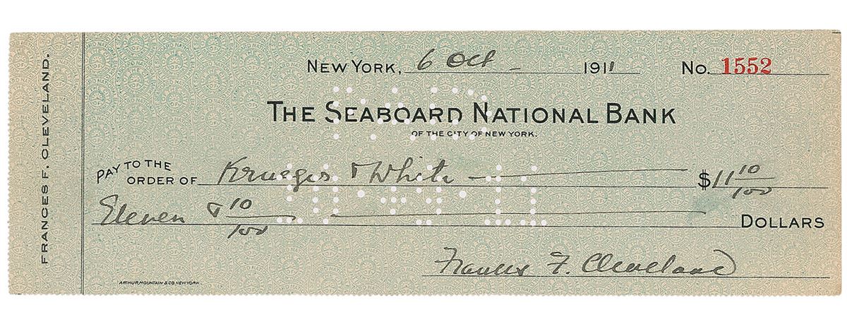 Pair of scarce checks: a bank check, 7.75 x 3, filled out and signed by Cleveland, “Grover Cleveland,” payable to The Princeton Bank for $50, March 16, 1908; and a bank check, 8.5 x 2.75, filled out and signed by his wife, “Frances F. Cleveland,” payable to Krueger & White for $11, October 6, 1911. In overall fine condition, with light toning and expected cancellation cuts and holes.