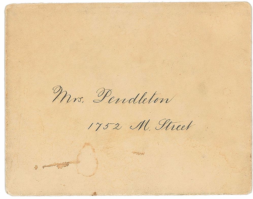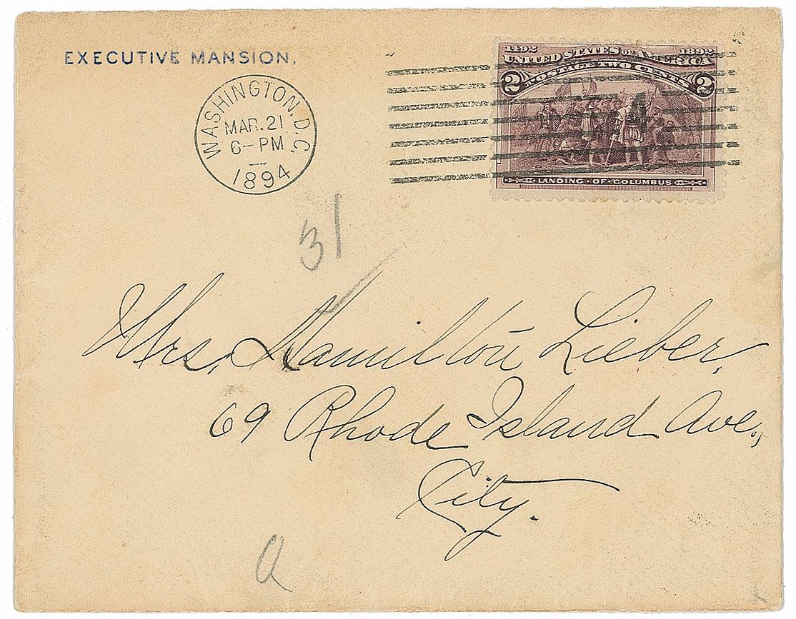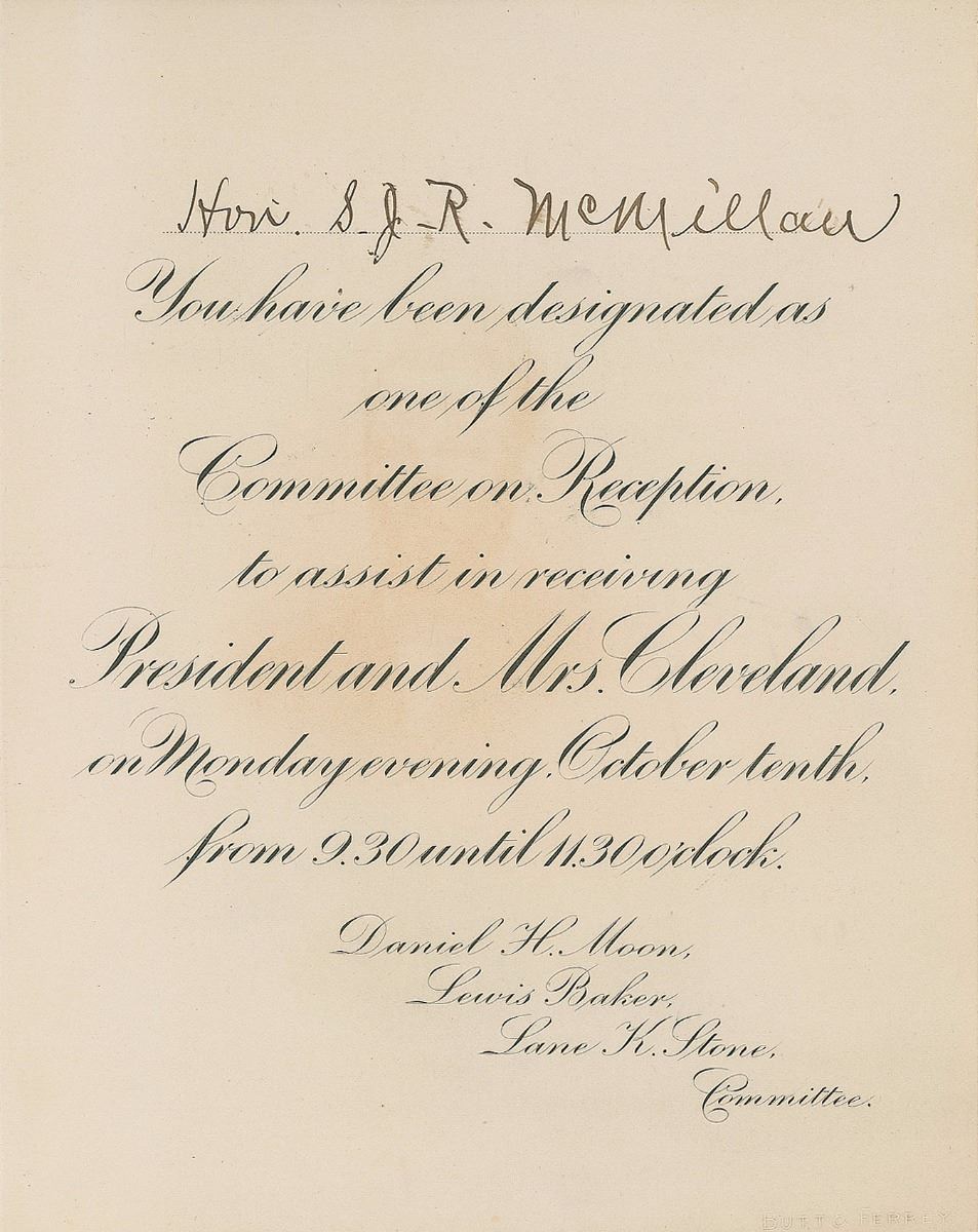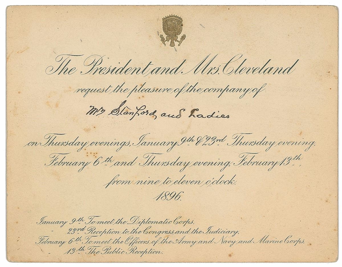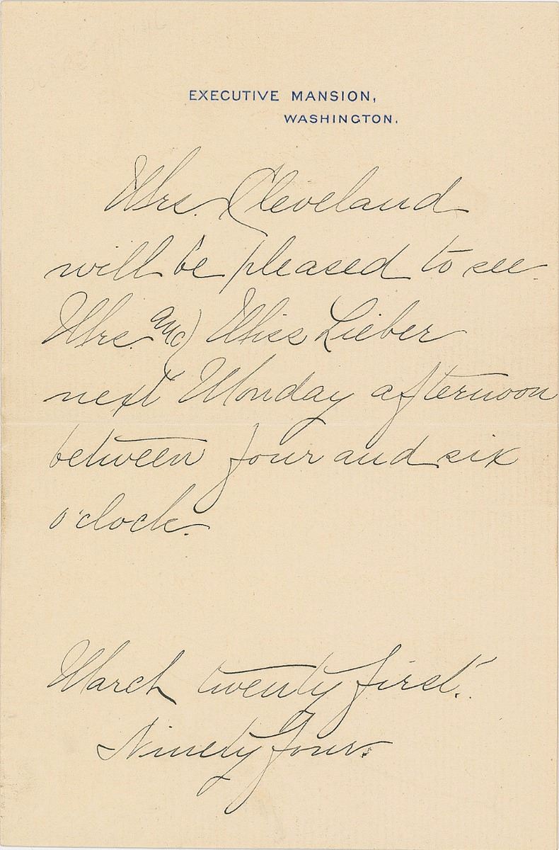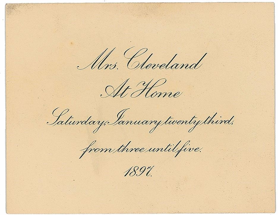 Four unsigned items: a partly-printed invitation from “The President and Mrs. Cleveland” for a series of meetings and receptions in early 1896; a “Mrs. Cleveland At Home” social arrangement card for January 23, 1897; a secretarial note on Executive Mansion letterhead, March 21, 1894, accepting an invitation on behalf of Mrs. Cleveland; and a card appointing a gentleman to the “Committee on Reception, to assist in receiving President and Mrs. Cleveland,” October 10, 1887. In overall very good to fine condition, with scattered toning and soiling.