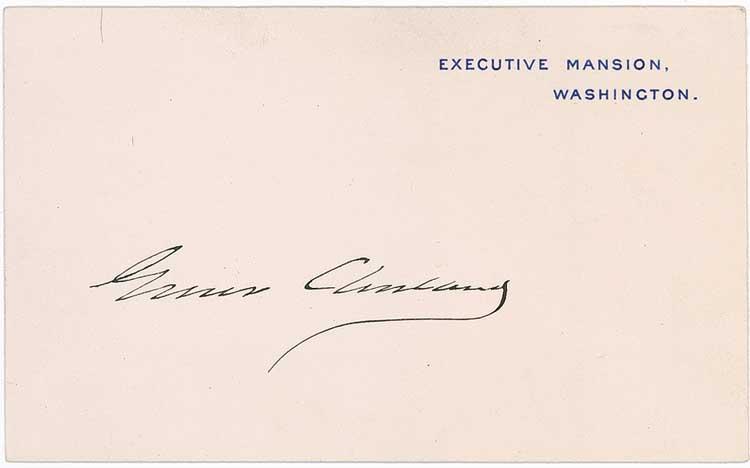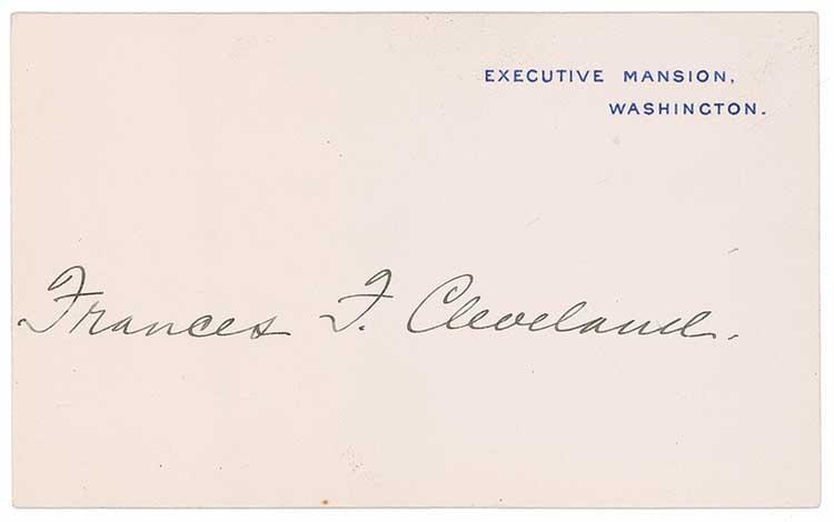 Two Executive Mansion cards, signed in black ink, “Grover Cleveland,” and “Frances F. Cleveland” respectively. In fine condition. Pre-certified John Reznikoff/PSA/DNA and RRAuction COA.