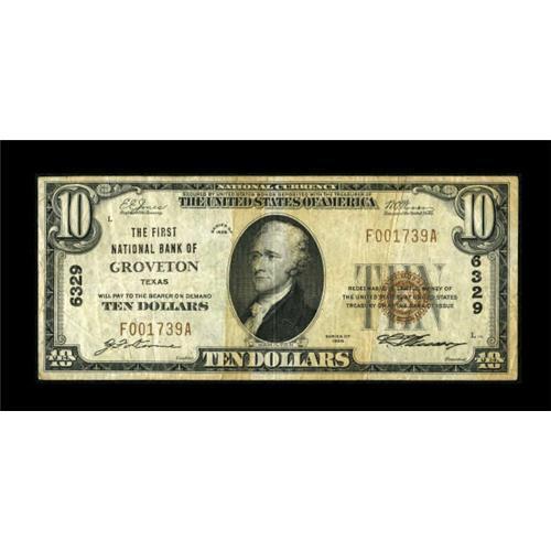<B>Groveton, TX</B></I> - $10 1929 Ty. 1 <B>The First NB</B></I> Ch. # 6329<BR> A tougher bank with only eight small notes making up the entire Series 1929 census from this bank. Z.F. Devine signs as cashier and L.P. Atmar as president. <B>Fine</B></I>.<BR><BR><b>Shipping:</b> Coins & Currency (<a target="_blank" href="http://www.heritageauctions.com/common/shipping.php">view shipping information</a>)