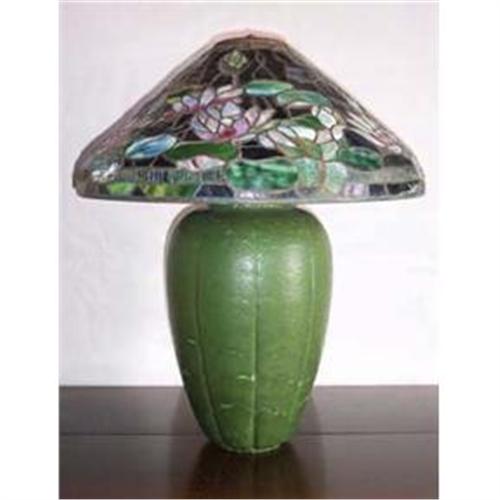 By 1905 a line of lamps paired Tiffany shades with Grueby ceramic vases. One such lamp sold at auction in June 1999 for $286,000. Our lamp is currently the only example of this design and form with an "Original LCT Pattern" water lily shade. A small professinal repair done in 1966 is undetectable to the eye. Never shown, photographed or offered in any sale, this is the first and only opportunity to purchase a museum quality Grueby Faience Lamp.