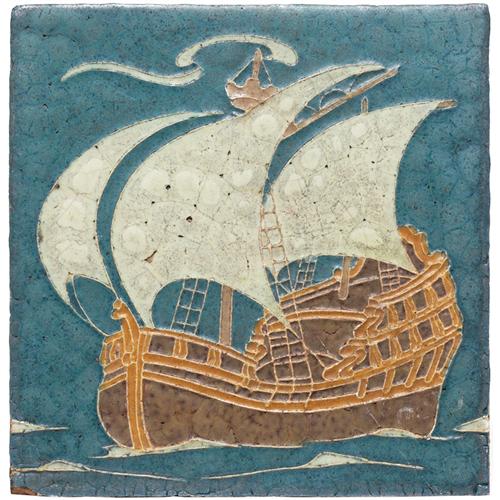 Grueby tile, ship in brown, tan and white matt against a blue background, 8"sq., minor chip to corner