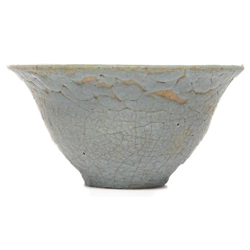 Grueby vase, flaring form covered with a blue suspended matt glaze, impressed mark,2.5in.h, firing line to interior