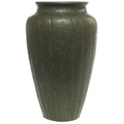 Grueby vase, shouldered form with vertical lines under a suspended green matt glaze, artist signed, impressed mark, 7.5”h, restored chip and two minor hairlines to rim