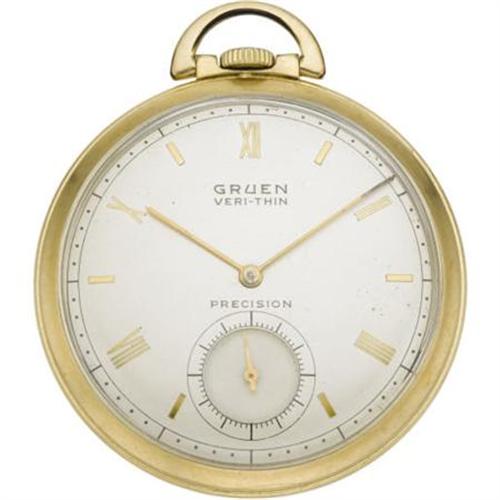 <B>Gruen, Gold-Filled Openface Pocket Watch</B></I><BR><BR>Case: 45 mm, circular, 10k gold-filled high polish finish, marked "Cased and Timed by Gruen Watch Co.," No. G928896, 385 571<BR>Dial: silvered with applied goldtone Roman numerals, goldtone hour and minute hands, with sunken auxiliary sweep seconds<BR>Movement: 37 mm, 17 jewels, unadjusted manual wind, No. 4-206379<BR>Signed: Triple signed on dial, case, and movement<BR><BR><b>Shipping:</b> Miscellaneous Collectibles, Smal (<a target="_blank" href="http://www.heritageauctions.com/common/shipping.php">view shipping information</a>)