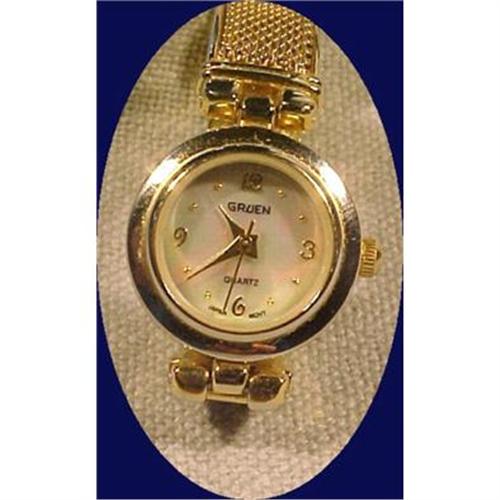Lovely Ladies Gold Gruen Watch with Mother of Pearl dial. It is excellent like new condition. There are many lovely colors that reflect from the shell face almost similar to that of abalone shell. </P> <P>The Mother of Pear Dial is 5/8” set in a lovely goldtone bezel and case. The goldtone time indicators are numbers at 12,3,6 and 9. The times in between are dots. </P> <P>It has quality Japan quartz movement. </P> <P>It comes on a lovely gold tone bracelet band with the front part being a mounted mesh design on a solid piece. The the rest of the band is gold tone links. The band with the watch measure about 6 5/8”. The solid part of the bracelet band has a curve to fit the curve of your wrist. </P> <P>The condition is excellent. It is not brand new but in brand new condition. It runs excellently with a brand new working quartz battery. </P> <P>