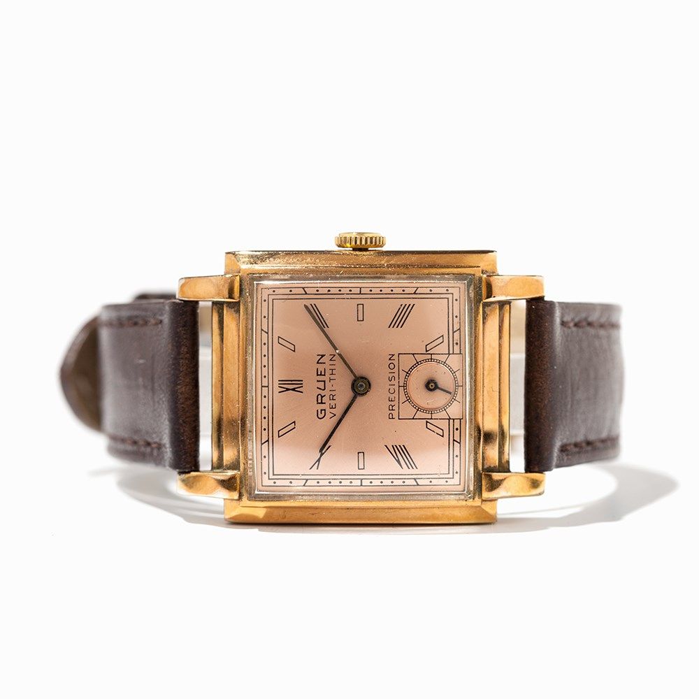 The present Gruen Veri Thin wristwatch was manufactured in Germany and dates to the time around 1945. The model has a manual wind movement and displays the hour, minute and small second. The copper colored dial is fitted with black hands and an index with Roman numbers. The case is made of gilded stainless steel and is attached to a brown leather strap with pin buckle.