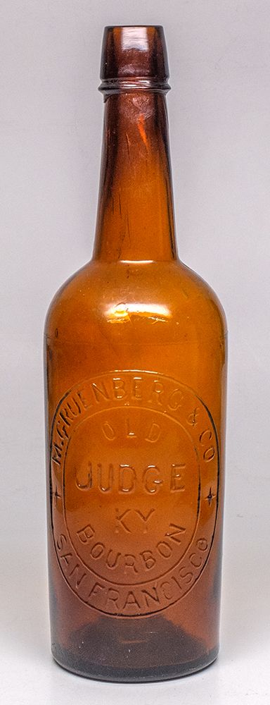 1879 Pretty light to medium amber color, 11 3/8" tall cylinder, with applied top. Embossing reads "M. Gruenberg & Co. San Francisco" in a circle around "Old/ Judge/ KY./ Bourbon." Some large bubbles in the glass, as-made. (Western Whiskey Bottles No. 4, R.E. Barnett) Bud Bassett Collection - HKA#65355