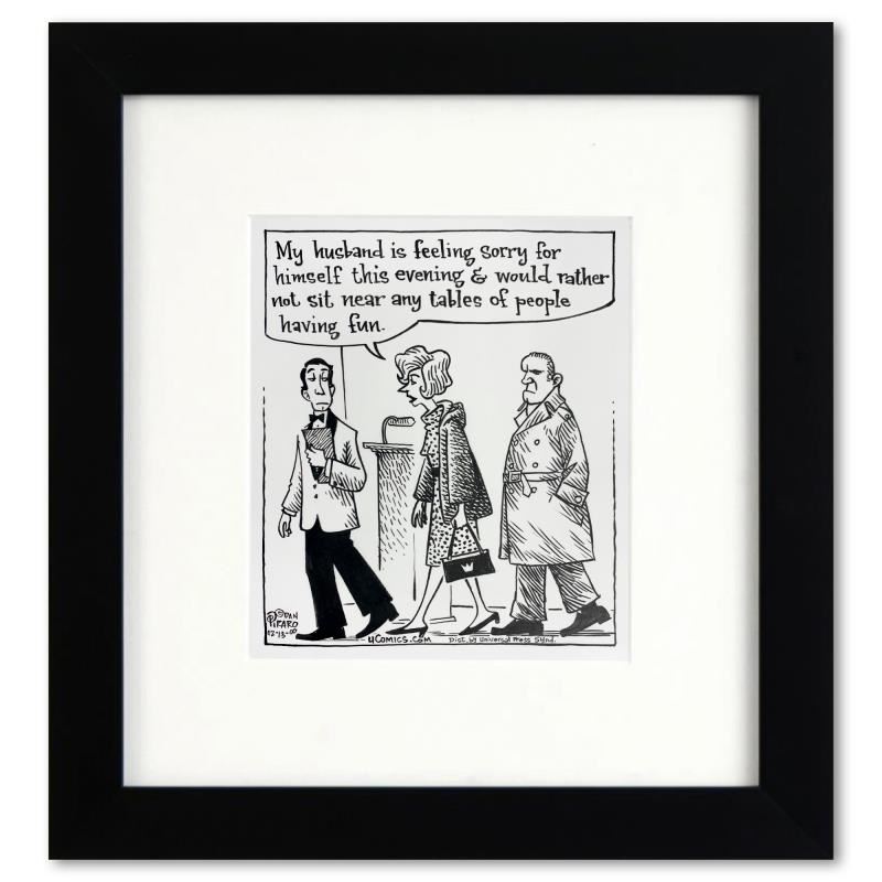 Enter a surreal and satirical world of twisted imagination and award winning creativity. "Grumpy Husband" is an original pen & ink drawing on paper by Dan Piraro, creator of the critically acclaimed and award winning comic strip, Bizarro. This piece is hand signed, comes custom framed and includes a letter of authenticity. Measures approximately 12" x 11" (frame), 7" x 6" (image).This item requires special handling and may have a longer than usual turnaround.