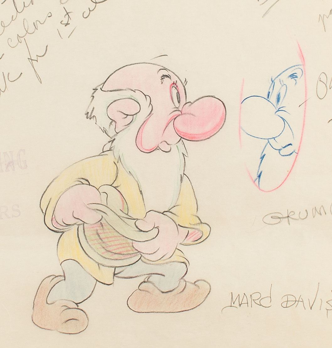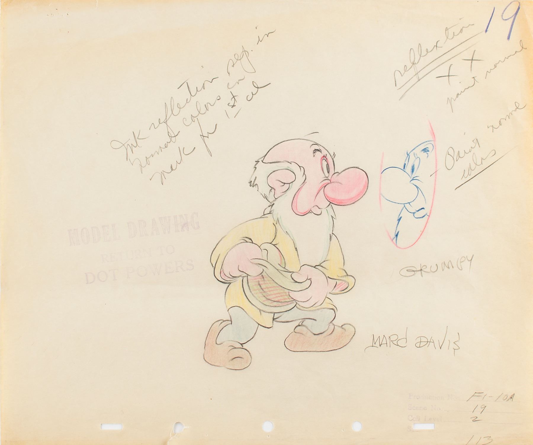 (Walt Disney Studios, 1937) Fantastic original color model drawing featuring Grumpy from Snow White and the Seven Dwarfs, signed in the lower corner in pencil, "Marc Davis." The great drawing shows Grumpy peering at his own reflection, and is stamped on the left side: "Model Drawing: Return to Dot Powers." Accomplished in graphite and colored pencil on untrimmed 12 x 10 animation paper, with animation instructions annotated in pencil. Main character image measures 3.5 x 5.25. In fine condition.