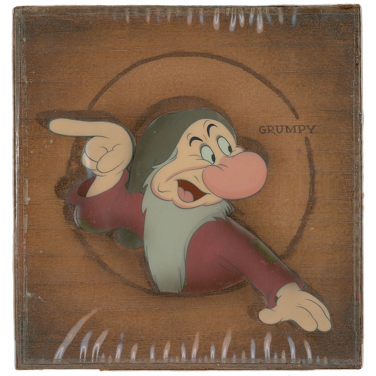 (Walt Disney Studios, 1937) Original production cel featuring Grumpy from Snow White and the Seven Dwarfs, showing him emerging from a circular hole and pointing his finger. The cel has been trimmed and applied to a woodgrain background as prepared by the Disney Studio to be sold at the Courvoisier Galleries. Image measures 5 x 4, with overall dimensions of 6 x 6.25. The piece has the original Disney Courvoisier Galleries label on the reverse. In fine condition. An attractive Courvoisier woodgrain background that features his name, and a great image of one of the most memorable dwarfs—although he was the most vocal of his dislike for her initially, at the climax of the film, Grumpy heroically leads the dwarfs on a mission to rescue the princess when the Queen confronts her, showing his care for her at full force.