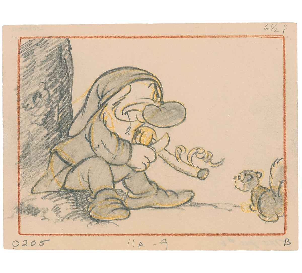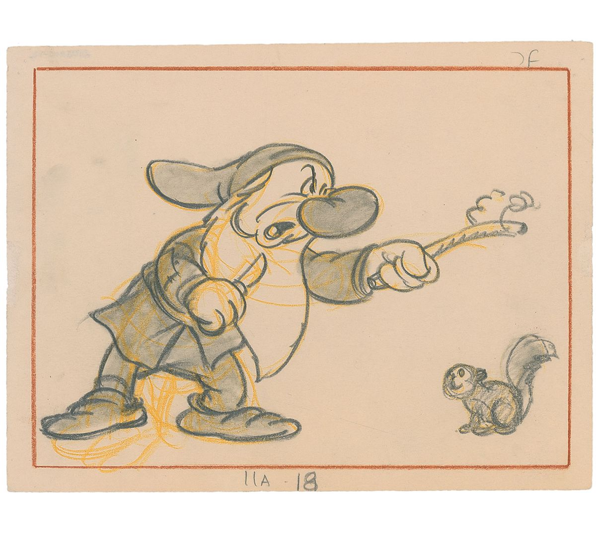 (Walt Disney Studios, 1937) Original set of two storyboard drawings featuring Grumpy from Snow White and the Seven Dwarfs, showing him angrily whittling as a squirrel looks on. Accomplished in graphite and colored pencil on two sheets of 7.5 x 6 trimmed animation paper. Images measure approximately 6.5 x 4. In fine condition.
