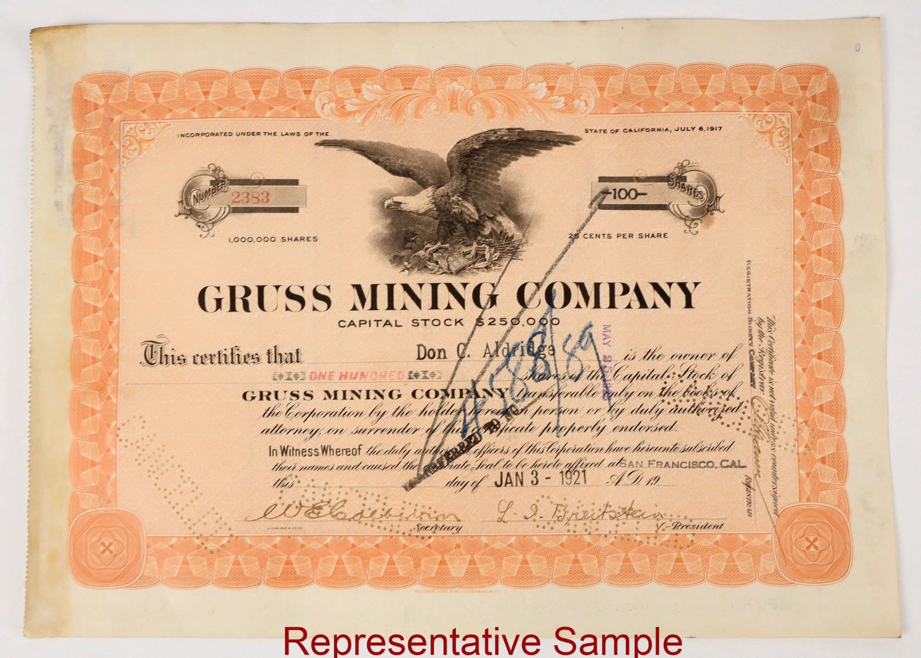 Gruss Mining Company Stocks. Plumas County, California. c1920s. About 1000 + issued certs.