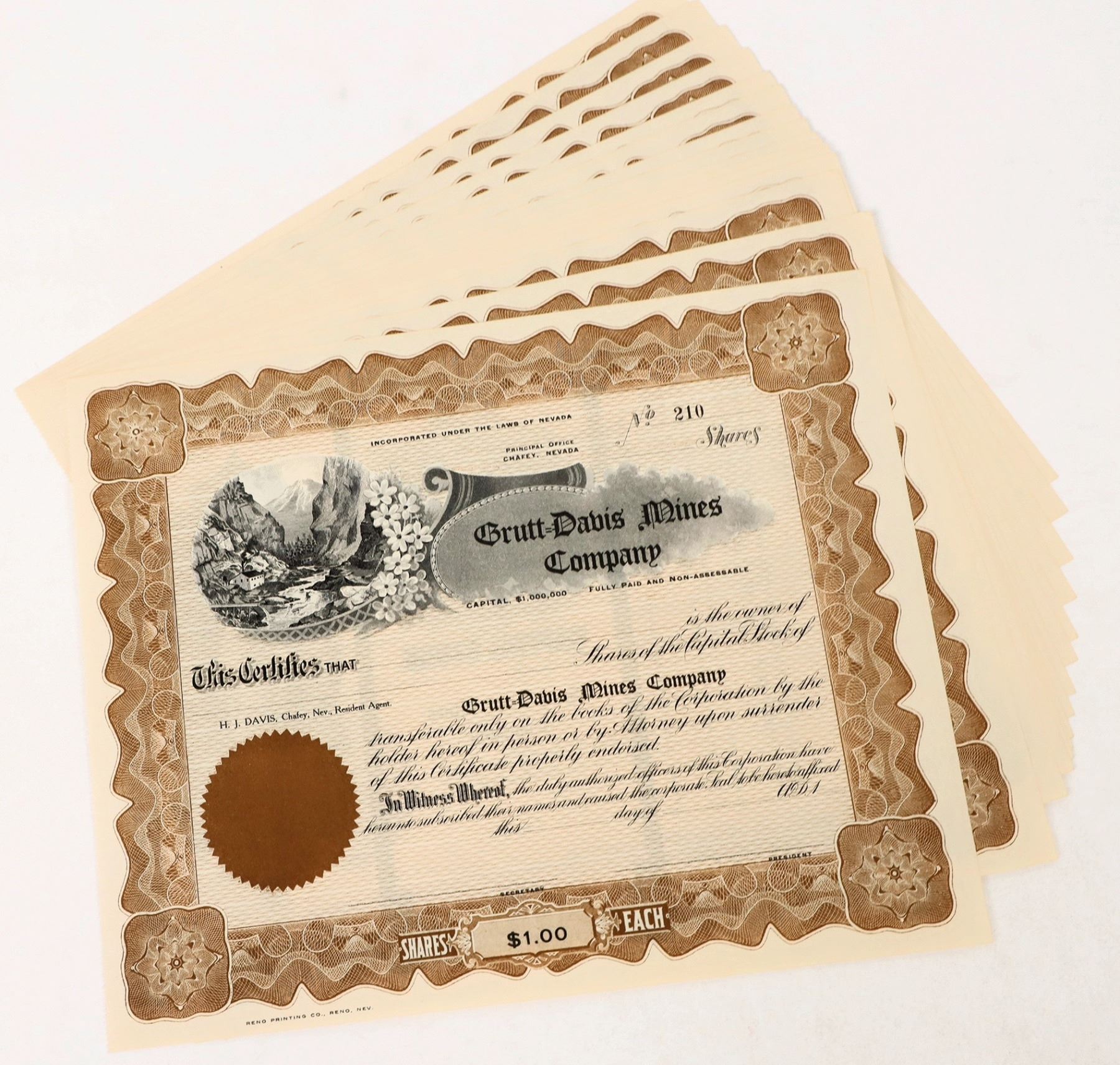 15 Grutt-Davis Mines Company Stocks, Unissued. Fabulous vignette. Company organized by Eugene Grutt and H. J. Davis as a silver mine in Pershing County, Nevada. Home offices were in Chafey, Nevada (formerly called Dun Glen).