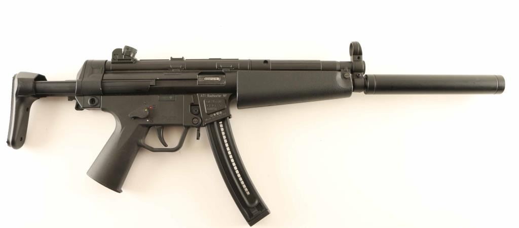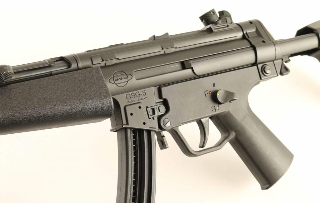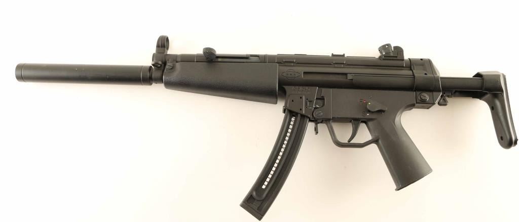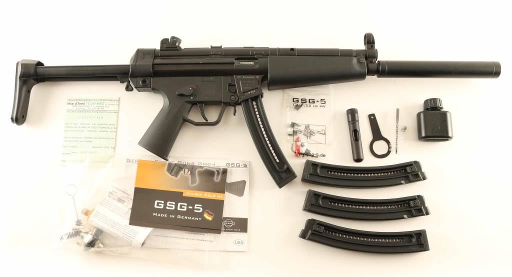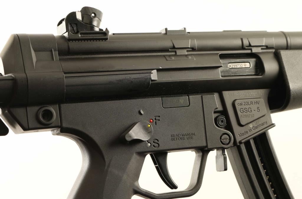 German made semi-automatic modern sporting rifle modeled after the iconic HK MP5(so much so that HK sued GSG), manufactured circa 2009. Features a matte black finish, 16.25" barrel with removable faux suppressor, hooded post front sight, 4-position rear drum sight, smooth trigger, ambidextrous manual safety, paddle & push button magazine releases, 22 round magazine, sling point, textured black synthetic forend, black polymer grip frame and collapsible shoulder stock. Includes the factory documents, lock, cleaning tools, addition front sights and three spare magazines. Rifle retains approximately 95% original finish showing slide wear on the bolt and scattered scuffs & small losses. Action is smooth, the bore is excellent, and the polymer is fine. Condition is NRA Very Good++. ***Modern Firearm***