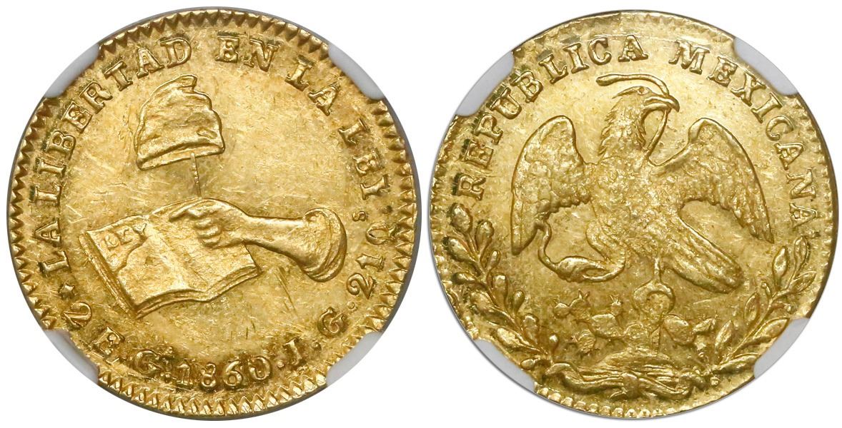 Guadalajara, Mexico, 2 escudos, 1860JG, encapsulated NGC MS 61. KM-380.3. Lustrous and boldly struck, nice yellow color, minor surface marks only, second finest in NGC census. NGC #4427774-002.
