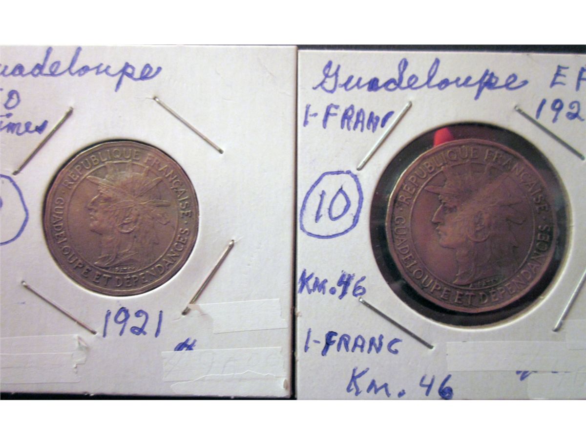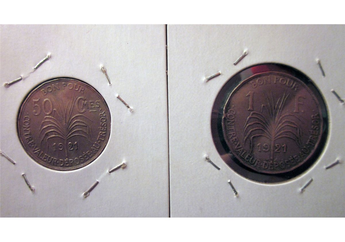Guadeloupe; 50 Centimes 1921 EF and 1 Franc 1921 VF+. Lot of 2 coins.