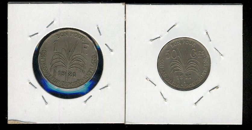 Guadeloupe; 50 Centimes 1921 EF and 1 Franc 1921 VF+. Lot of 2 coins.