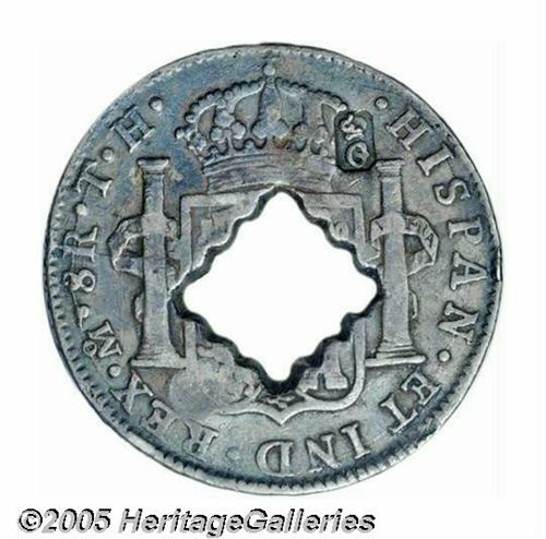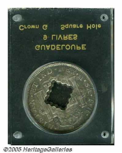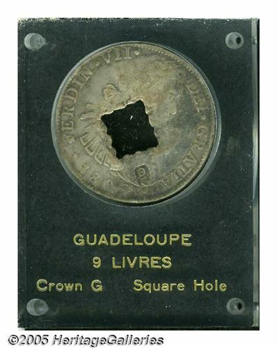 <B>9 Livres ND (1811), </B></I>KM26, crenated square center hole and crown G counterstamp on a Mexico 8 Reales 1809-TH. The host coin is toned AVF and the counterstamp is VF. Very scarce.