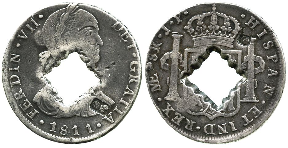 Guadeloupe (British occupation), 9 livres, crenelated square hole in center and crowned-G countermarks (1811) on a Lima, Peru, bust 8 reales, Ferdinand VII transitional (imaginary bust), 1811JP. KM-36. 23.4 grams. Richly toned VF, the host coin slightly off-center, both countermarks bold and the center cut with distinct crenelations, a traditionally rare and desirable West Indies issue on a scarce-type host. Pedigreed to the Cayon auction of February, 2012, with lot-tag #1213.