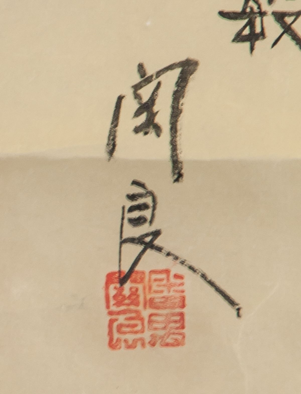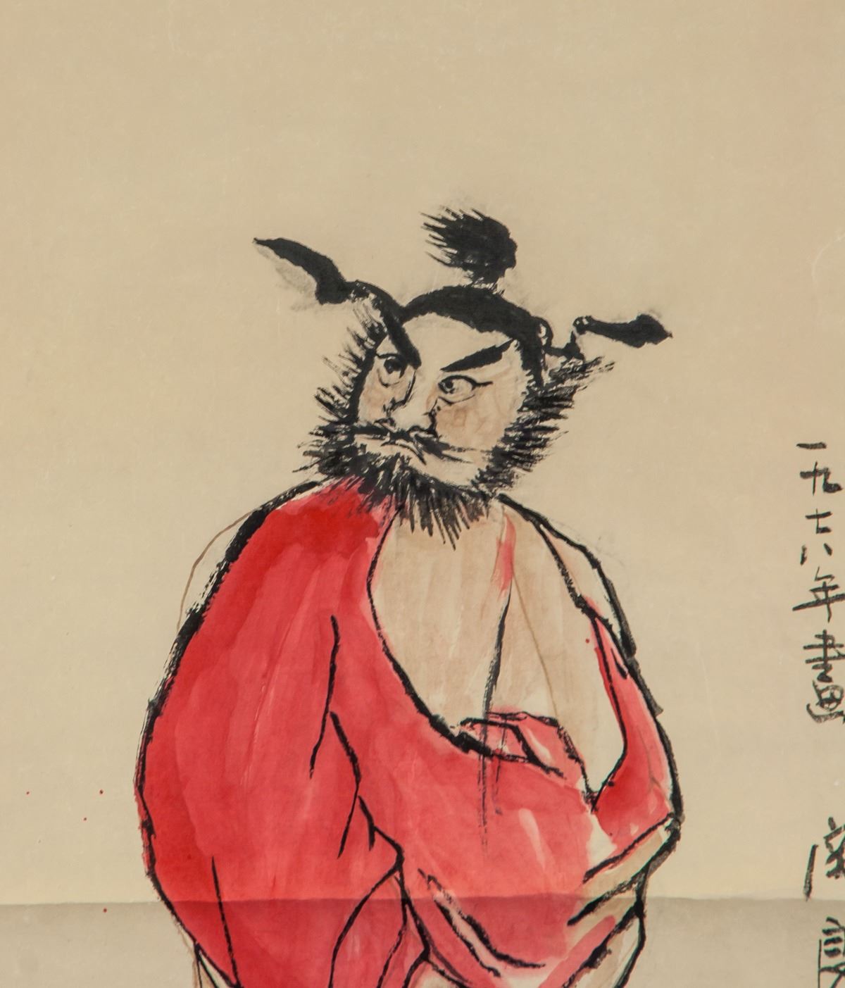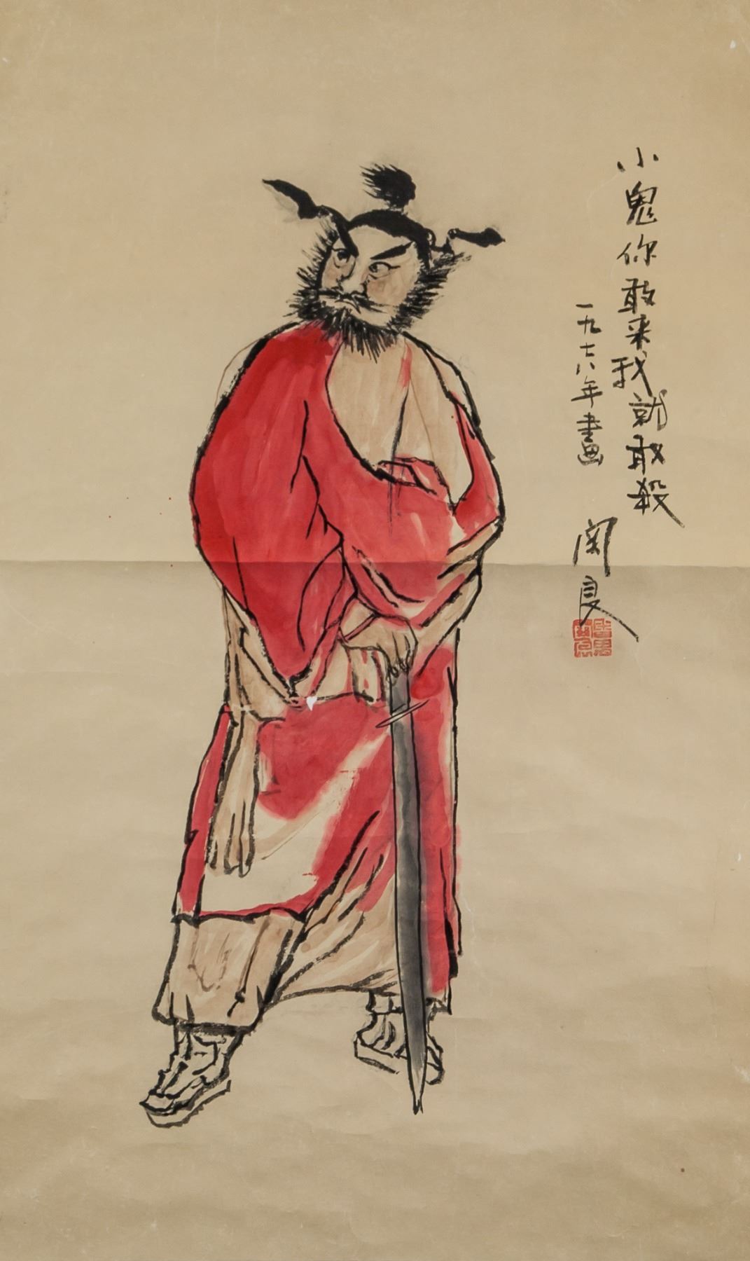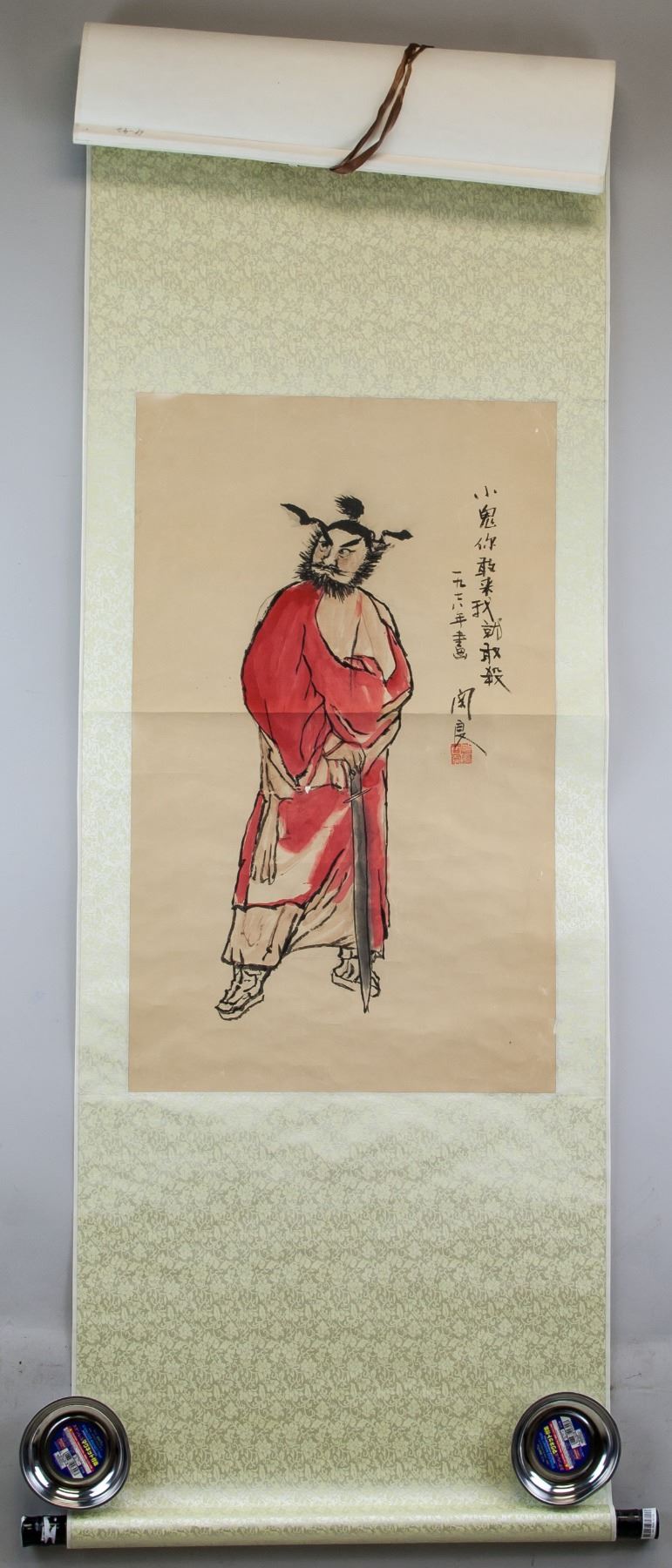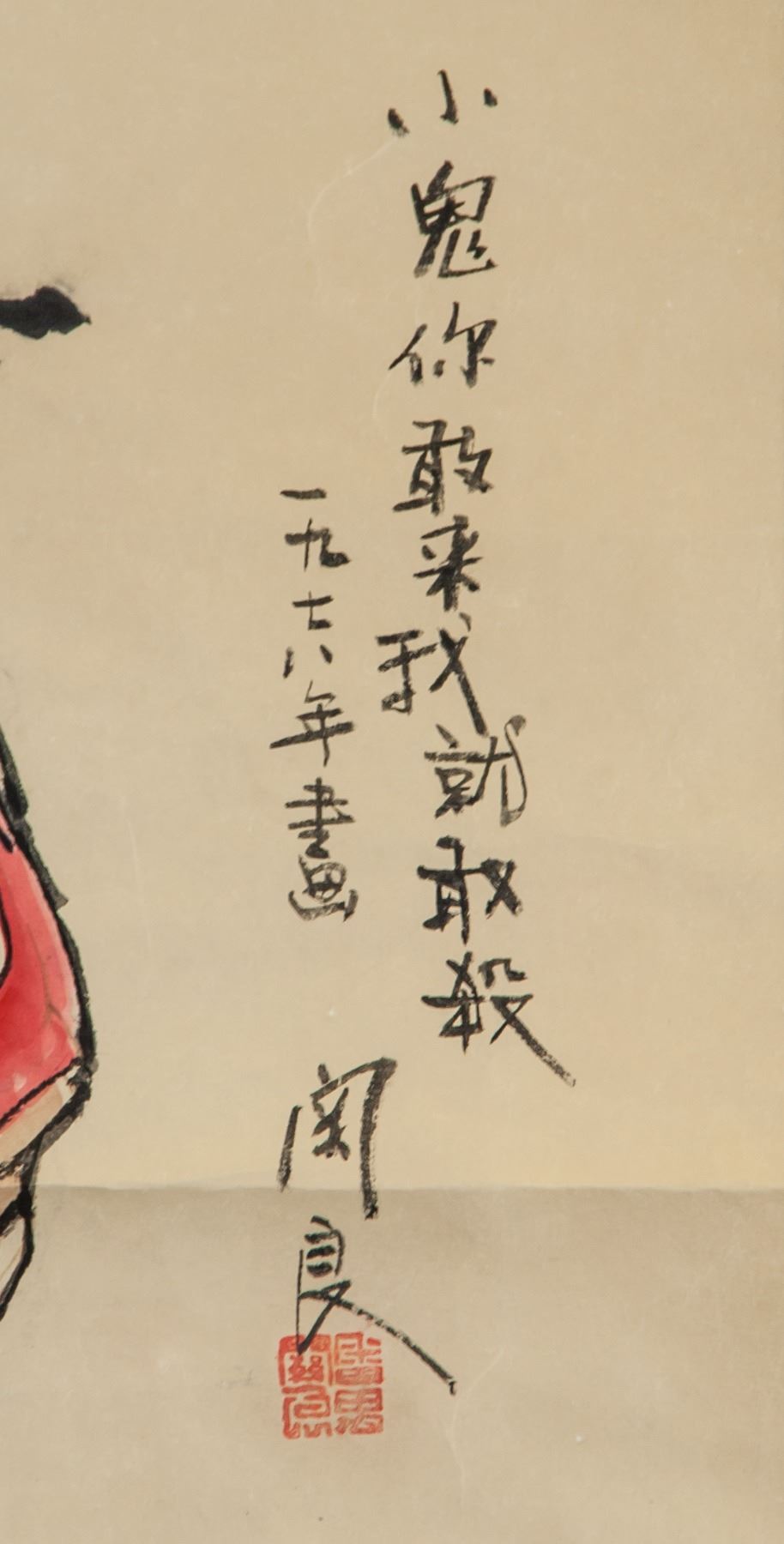 Watercolor and ink on paper, hanging scroll. Featuring standing Zhong Kui, the demon vanquisher. Signed Guan Liang 1900-1986 Chinese, inscribed with 1 artist seal. 69 x 42 cm.
