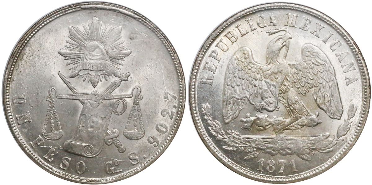 Guanajuato, Mexico, 1 peso, 1871S, encapsulated NGC MS 61. KM-408.4. Among the finer Mint State examples (highest grade seen in NGC census is MS 62), with bright white luster, light bagmarks, large die-crack across bottom above PESO, light gold toning around eagle.