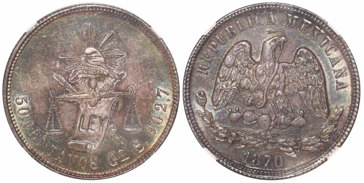 Guanajuato, Mexico, 50 centavos, 1870S, encapsulated NGC MS 63, tied for finest known in NGC census.