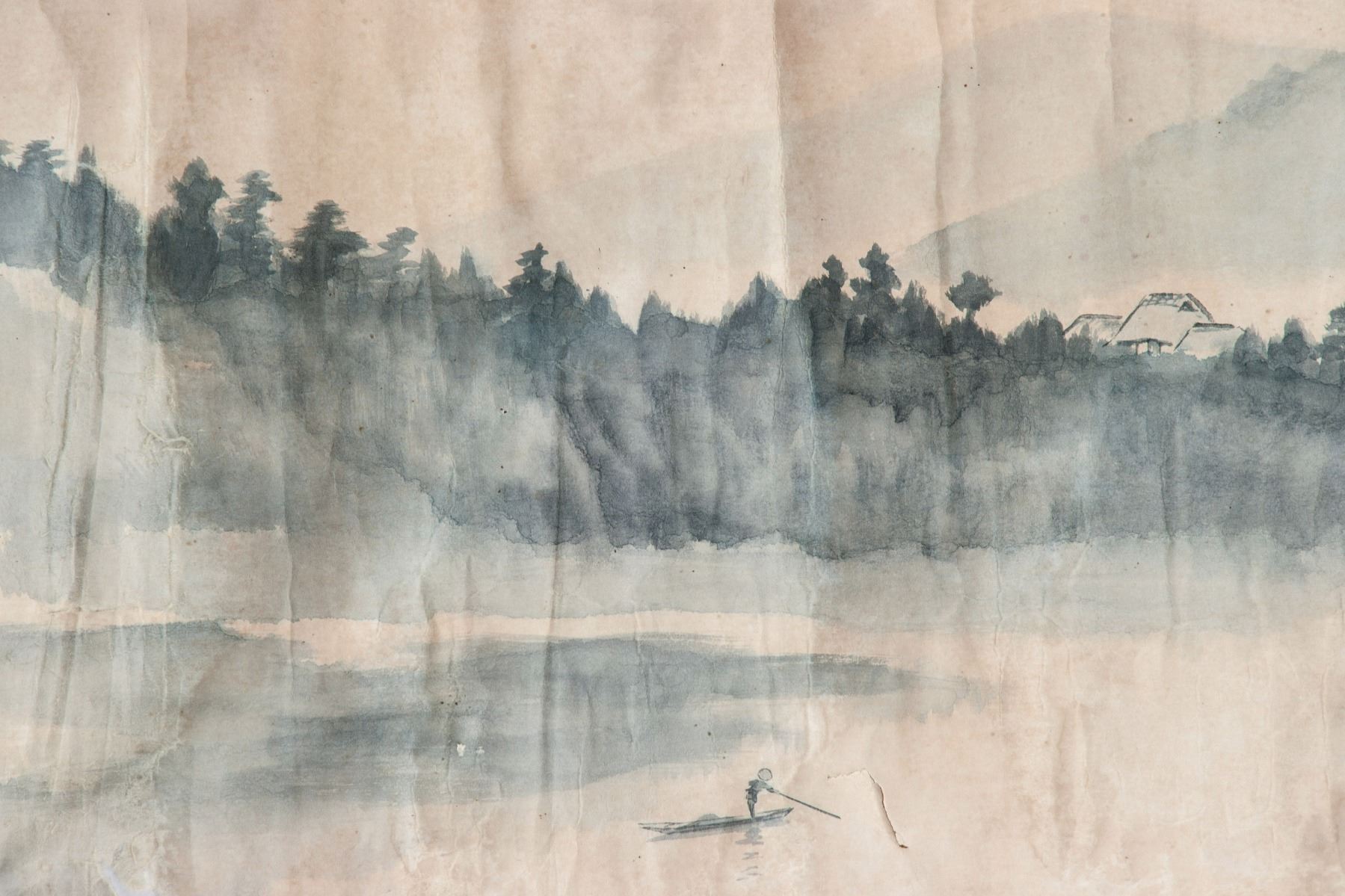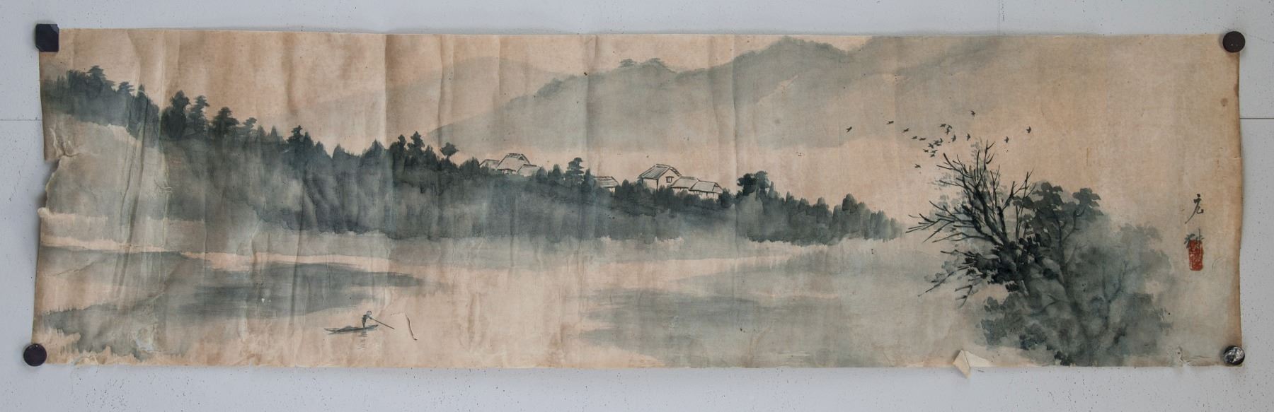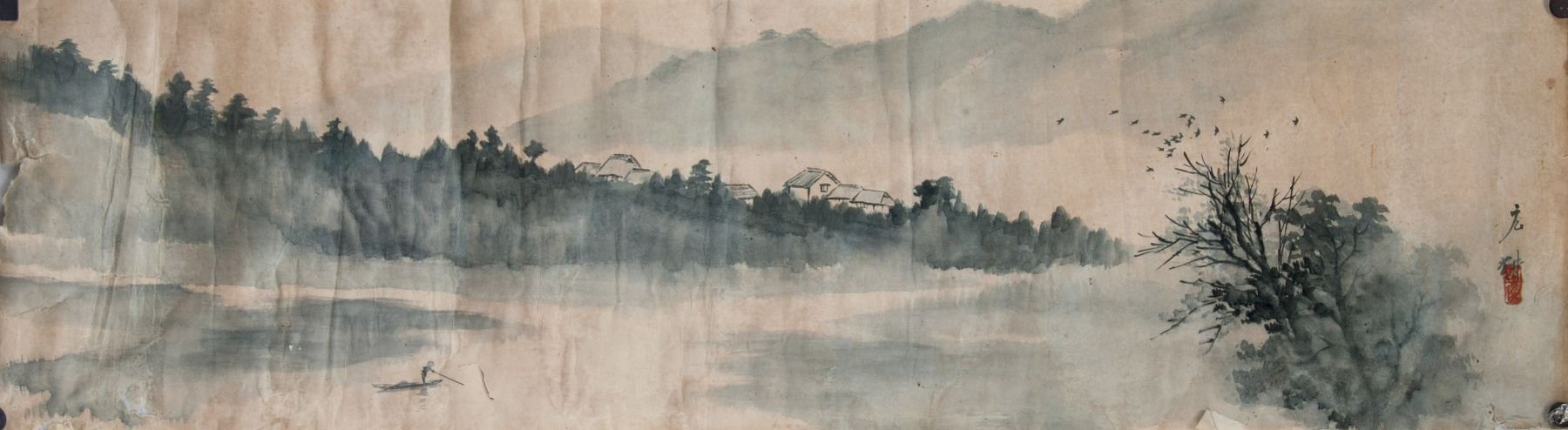 Mountainous landscape and fishing man; Chinese ink on paper; signed Guang Geng; inscribed with 1 artist seal; 16th-18th century; 30 cm x 106 cm