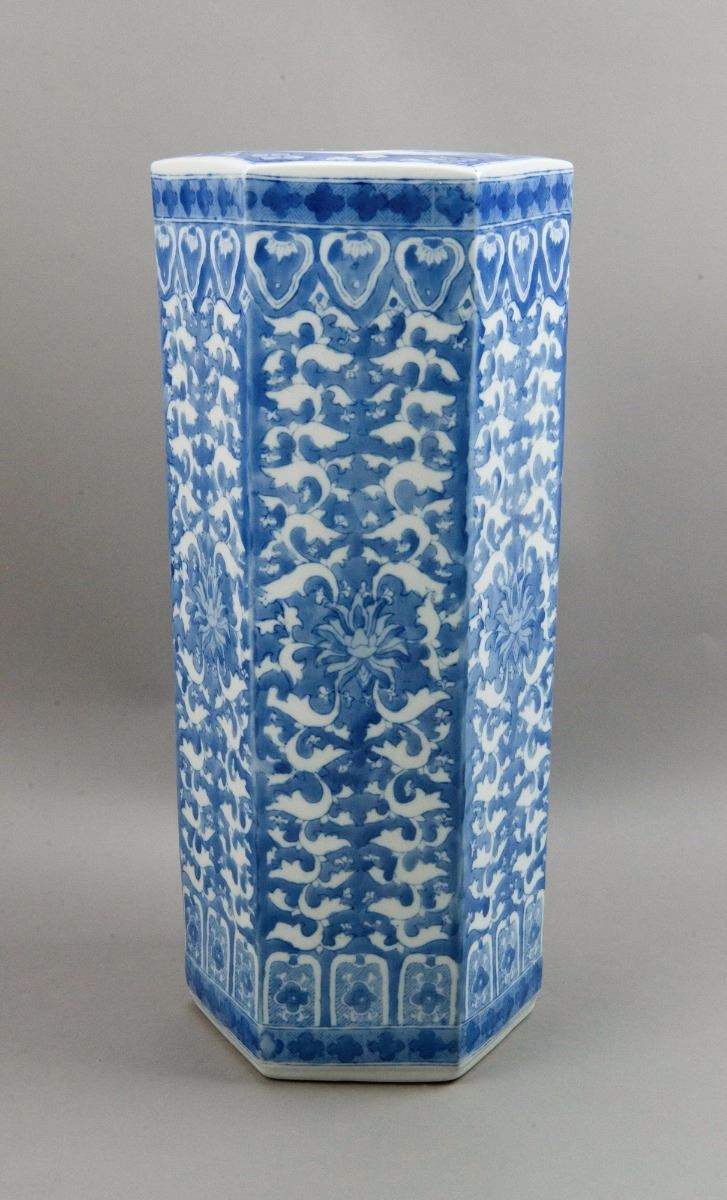 Qing Guangxu mark and period, Chinese blue and white porcelain umbrella stand, of hexagonal form, richly cover with lotus and petals in underglaze blue. H: 51 cm, W: 23.5 cm, 5500 grams.