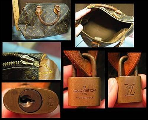 Guaranteed Authentic Louis Vuitton ladies handbag with official Louis Vuitton lock. Bag is used. Key to lock is in bag. Zipper pull is missing. Bag stands 7" tall