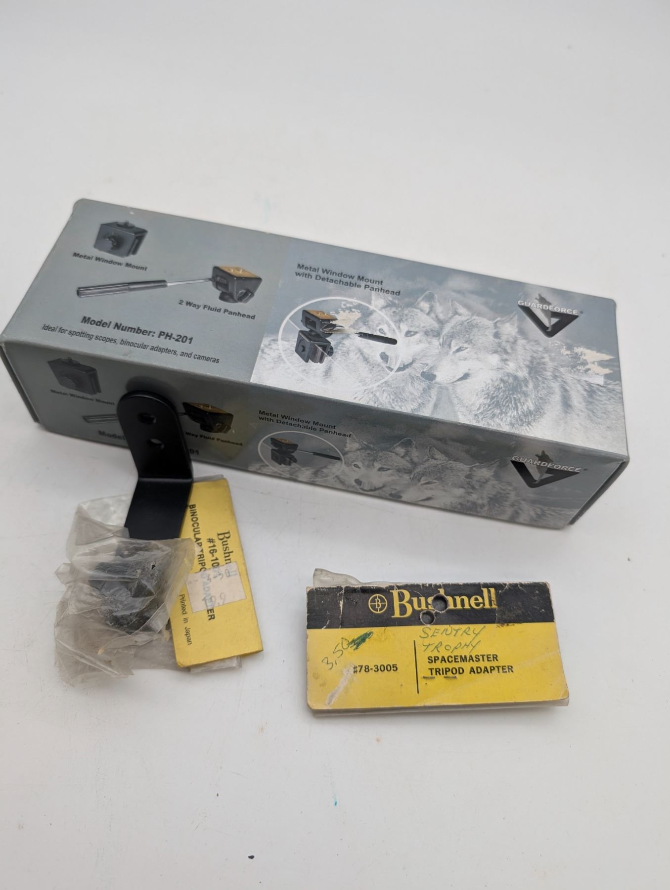 For use with spotting scopes, binocular adapters, and cameras. Also included is a Bushnell brand space master tripod adapter.