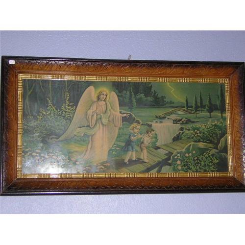 This Guardian Angel on a bridge framed picture is from Belgium. These types of pictures were generally done by a priest and signed on the bottom. I don't know if this one is signed as I have never taken it apart and it is in it's original frame.