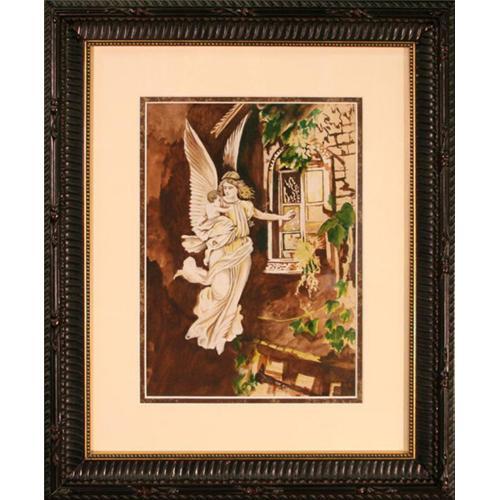 This incredible and original watercolor, painted by a terrific Canadian artist, portrays a very attractive scene comprised of an angel gently holding a baby. The monochromatic color scheme creates a soothing tone, not overpowered by bright colors at all. The brushwork is smooth and fluid, creating lovely contrasts between the darks and the lights. The angel is also very detailed, from the tip of her wings to the beautiful flowing drapery that engulfs her body and the child?s. This incredible art work is double matted, with a very distinguished brown and gold mottled inner mat and a very complimentary beige outer mat. Both mats work together to bring out the highlights and deepen the undertones. The frame is an exquisite deep chocolate color with a decorative golden inner lining; setting off this work of art perfectly. Including the frame, the piece is 16 ¼? x 19 ½?. This is truly a fantastic buy when considering the expense.