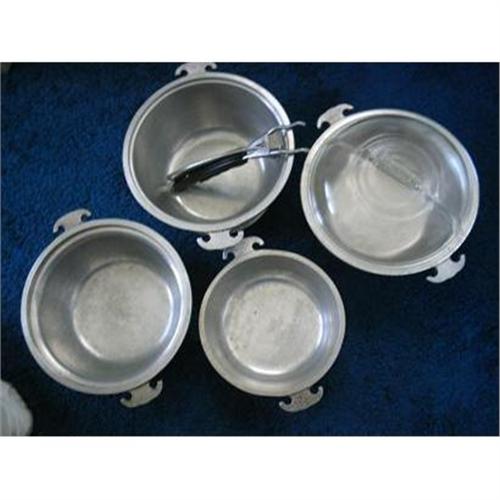 This wonderfully old Aluminum 4 piece pot set is marked Guardian Service with a Knights Head inbetween the wording. There is a lid with the set but it has a crack in it which I have shown in my pictures and only 1 bakelite handle that is cracked and missing some of the pieces. The pots do need a thorough cleaning but I'll leave that up to the new owner.<BR>The large pot measures 4 1/2 inches high and 9 3/4 inches round. The 2 medium pots measure 3 7/8 inches high, 9 3/4 inches round and the smallest pot measures 3 1/4 inches high and 8 inches round. These pots have many years left in them, they certainly were made to last and would be a great addition to any Vintage Aluminum or Kitchen Collection.<BR>SH & Ins. will be quoted after orders placed. If you have any questions please contact me and thank you for looking.