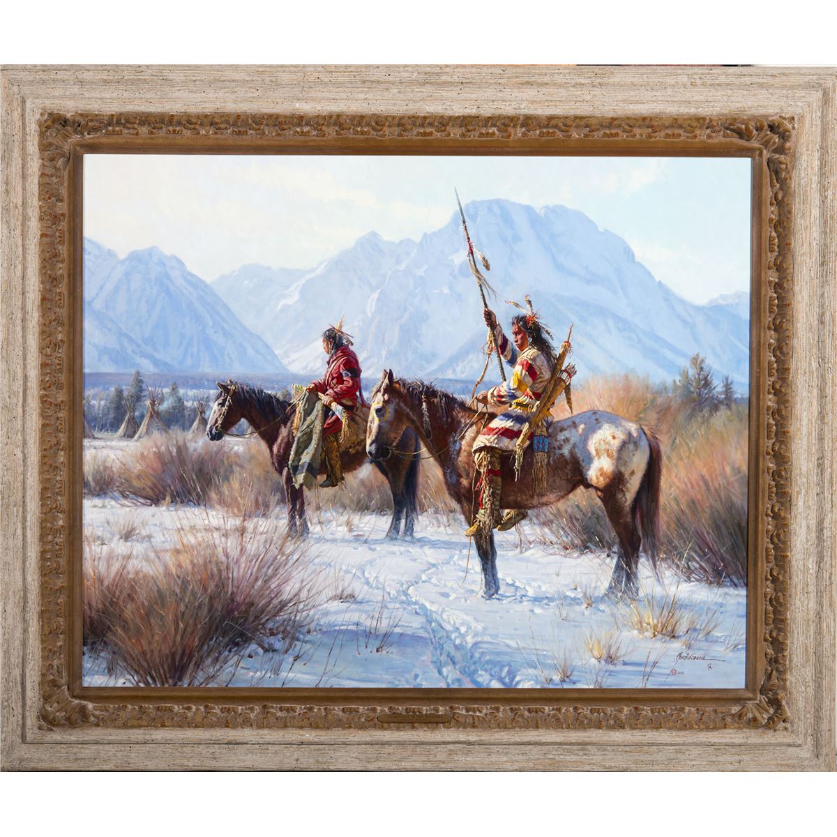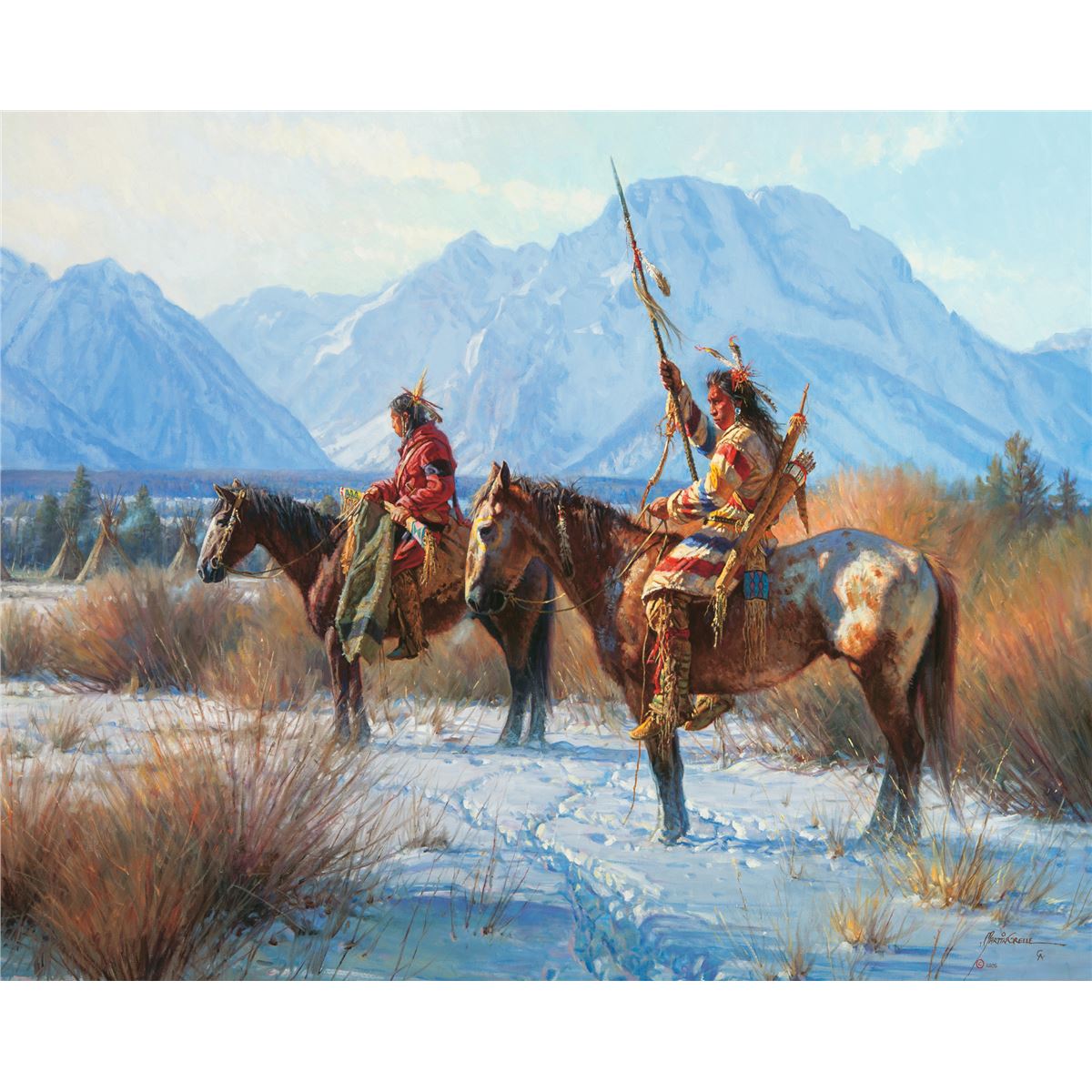 Martin Grelle is unquestionably one of the preeminent painters of Native Americans. His dramatic, precise canvases contain a wealth of details arranged in strong compositions. Guardians in the Willows is classic Grelle. In hard, cold blue light that etches shadows in the snow, two warriors stand a chilly watch at the edge of a camp. Their horses, shaggy coated against the season, snuffle frostily—you can see their breath in the air—struggling to stand, and stand in, this weather. Grelle gives us a sense of just how cold it is by making the folds in the blanket coat and blankets seem brittle and stiff. Tough men and tough horses do a very tough job.