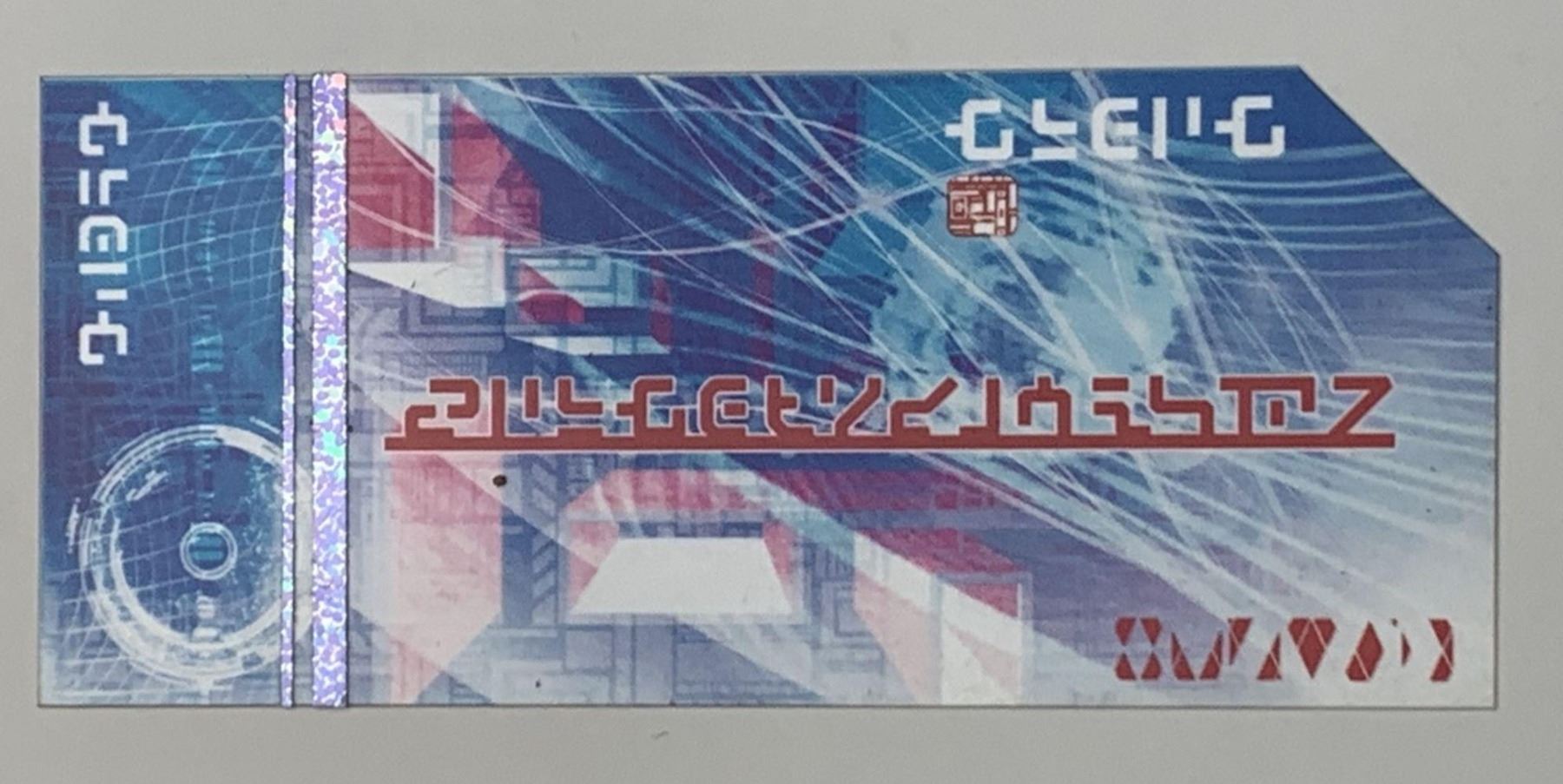 Original blue currency card used in the superhero film "Guardians of the Galaxy" (2014), where a group of intergalactic criminals must pull together to stop a fanatical warrior with plans to purge the universe. The film was directed by James Gunn, who wrote the screenplay with Nicole Perlman, and features an ensemble cast including Chris Pratt, Zoe Saldana, Dave Bautista, Vin Diesel, and Bradley Cooperas the titular Guardians, along with Lee Pace, Michael Rooker, Karen Gillan, Djimon Hounsou, John C. Reilly, Glenn Close, and Benicio del Toro.
