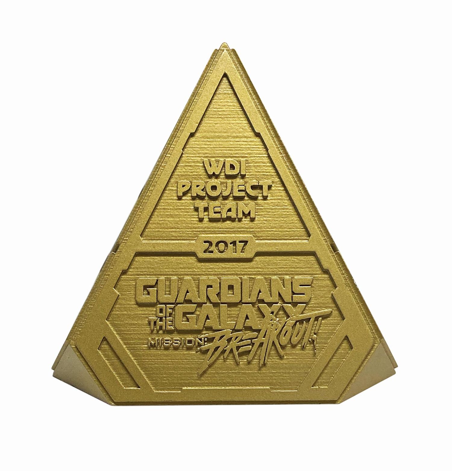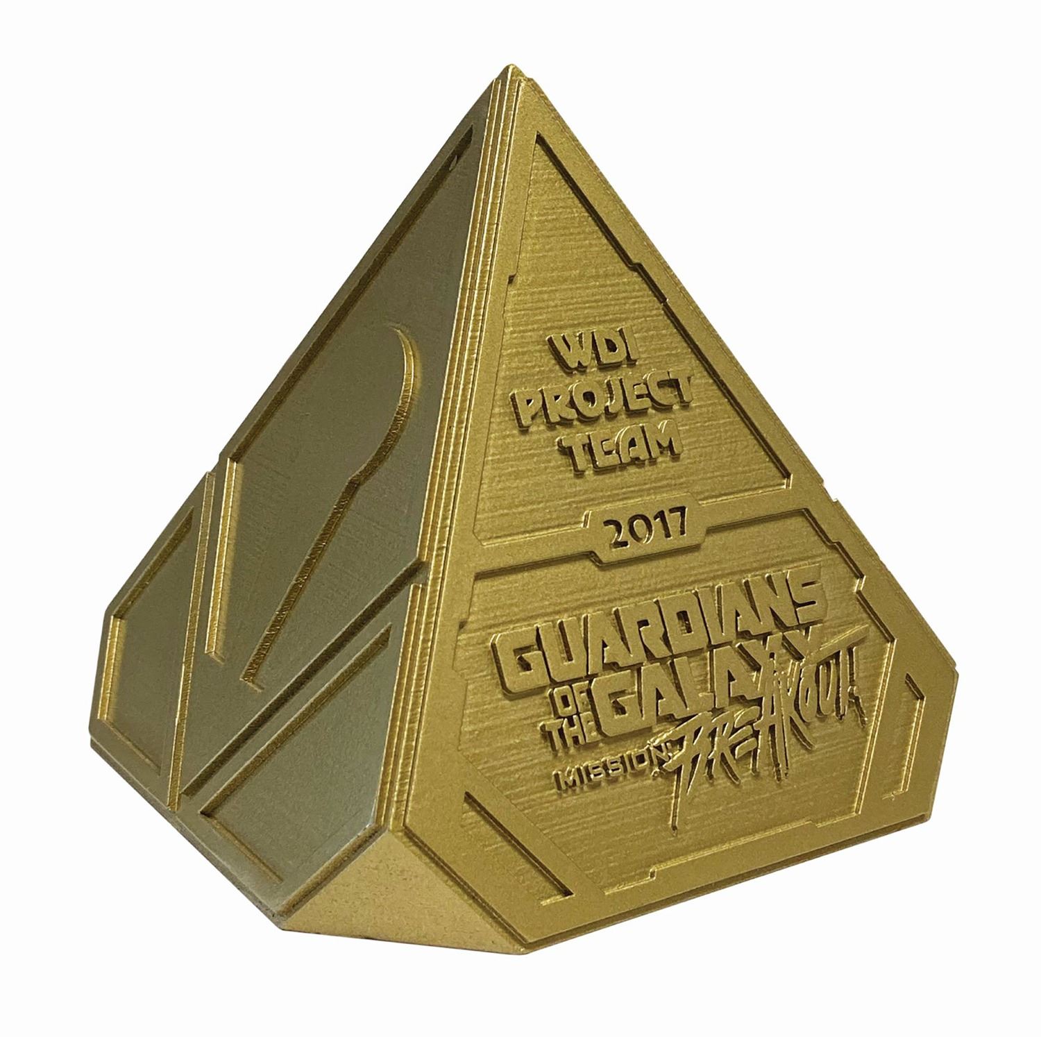 (California Adventure, 2017) A pyramid-shaped crew gift created to commemorate the opening of Guardians of the Galaxy - Mission: Breakout! at Disney’s California Adventure. Cast in high density urethane and painted metallic gold to appear as exotic alien technology, the award features relief lettering designating the WDI Project Team for the attraction. It retains an internal Disney and Marvel combination copyright sticker. Measuring 5.25” tall, the piece is in fine condition.