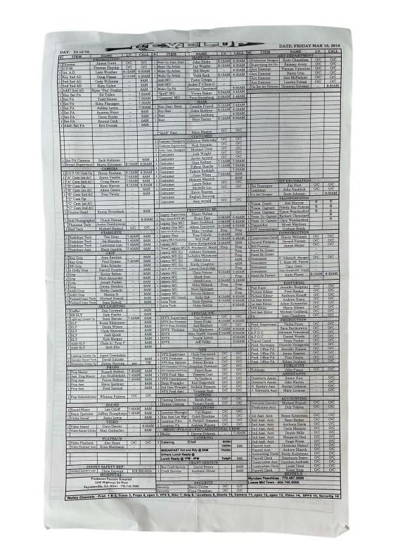 Guardians of the Galaxy Vol. 2 (2017) - Call Sheet.