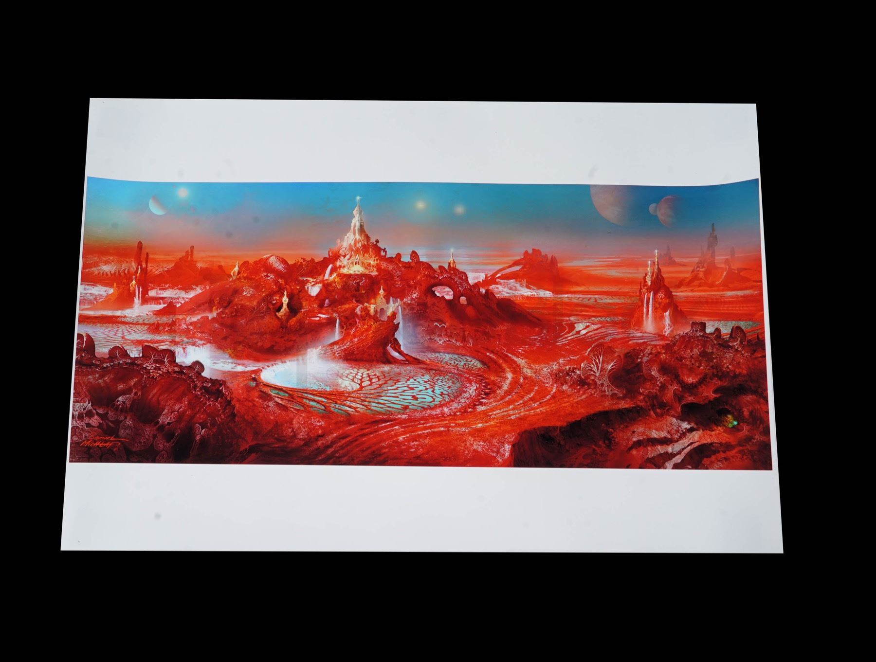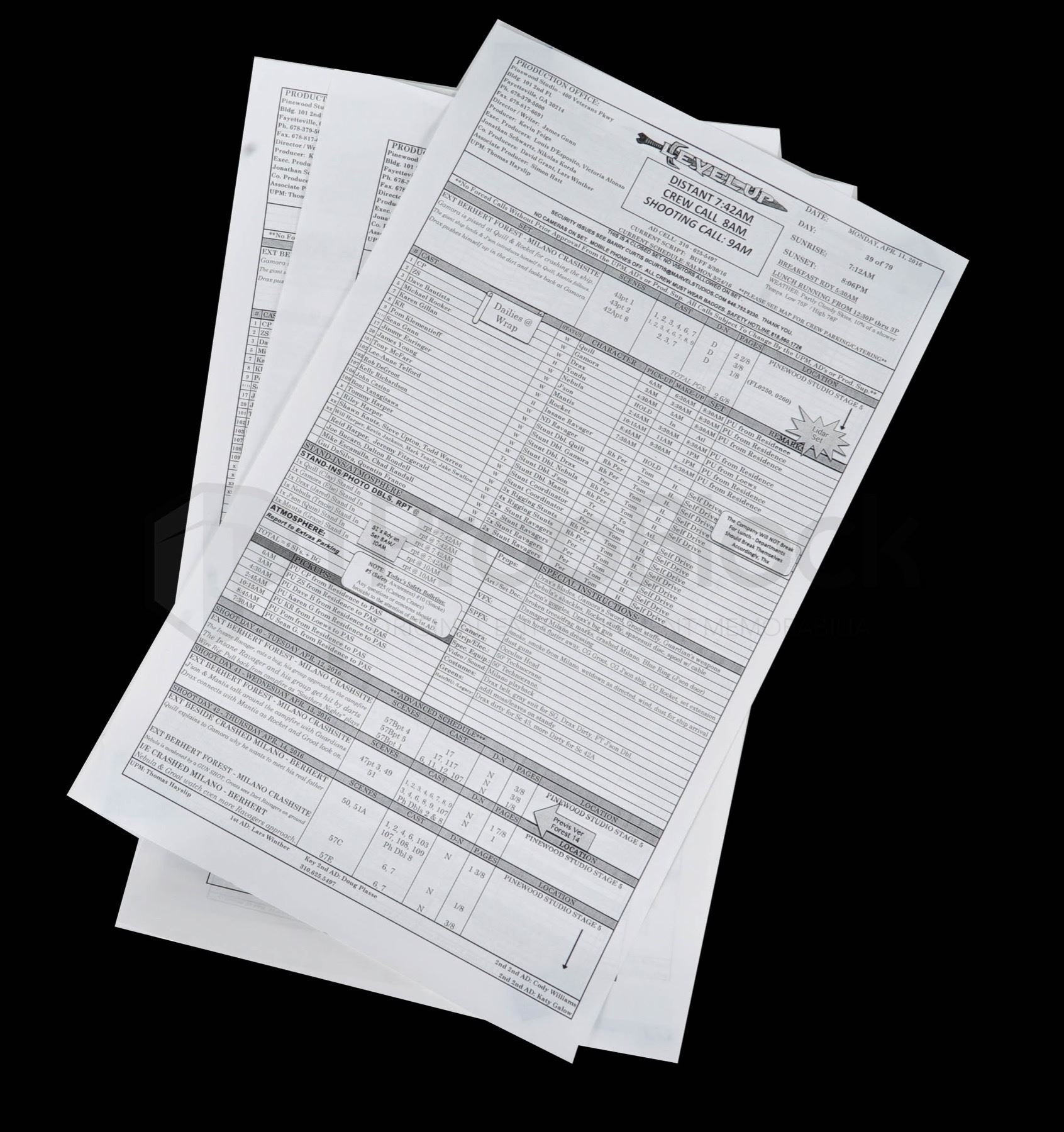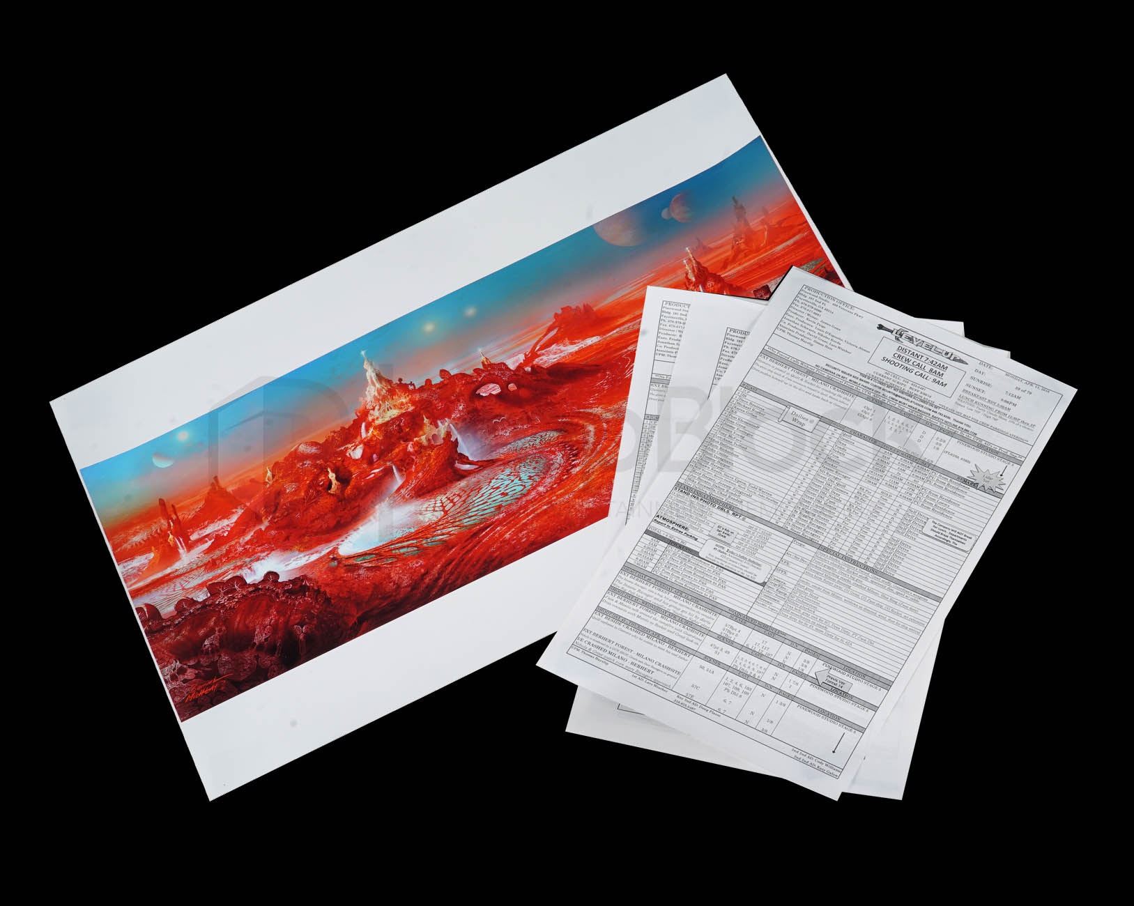 Selection of artwork and call sheets used in the production of Guardians of the Galaxy Vol.II. The Guardians struggle to keep together as a team while dealing with their personal family issues, notably Star-Lord's encounter with his father the ambitious celestial being Ego. This set features a 11" x 17" concept illustration of the planet "Ego" which was printed in full color and high resolution. Also included are three call sheets featuring the working title "Level Up". This set remains in excellent, production used condition.