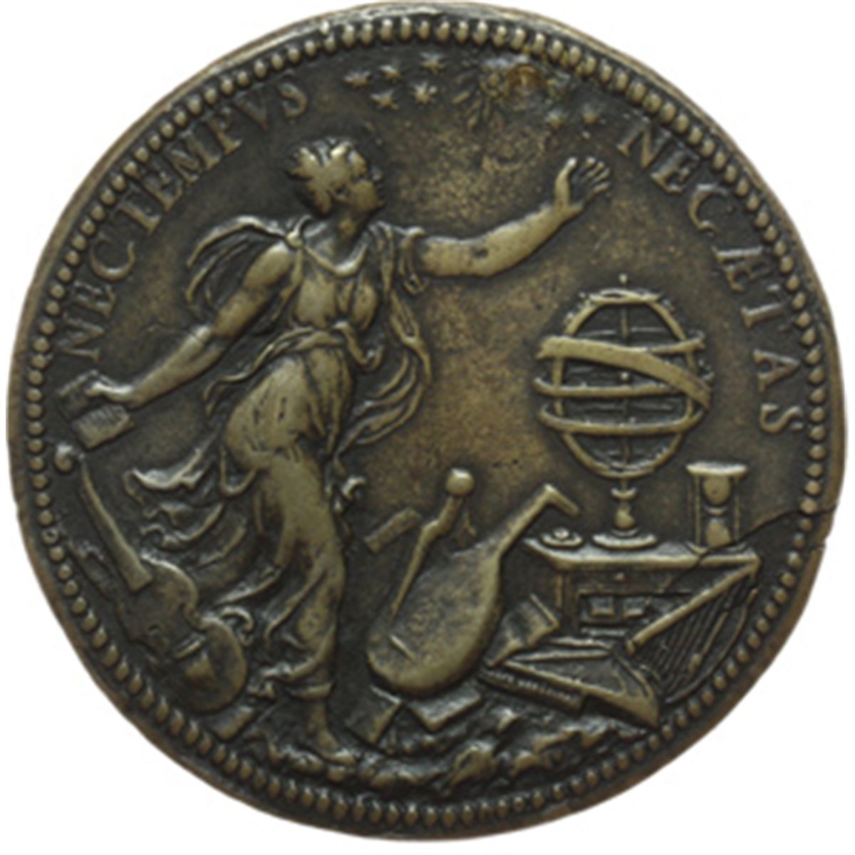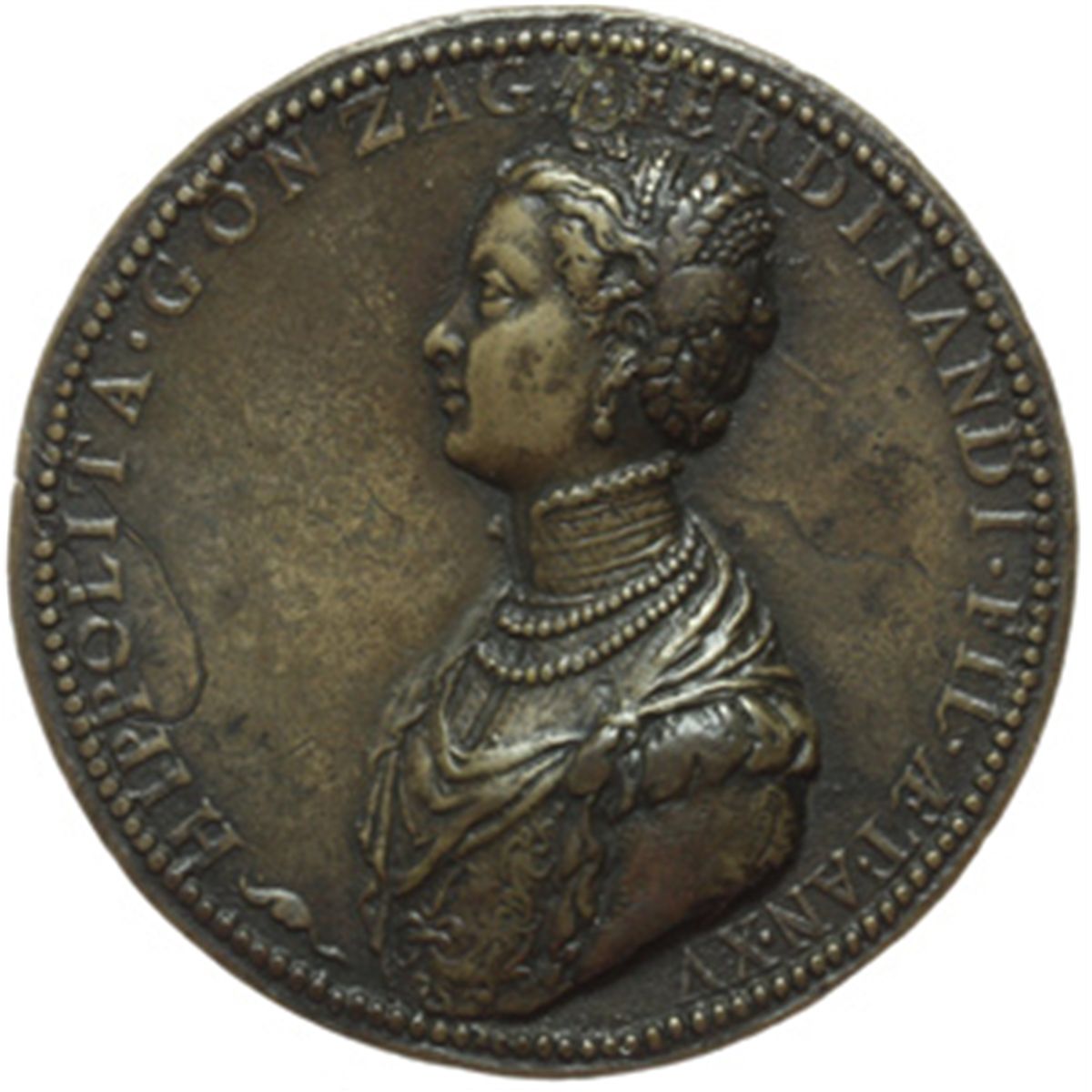 Monete e Medaglie di Zecche Italiane. Guastalla. Ippolita, figlia di Ferrante Gonzaga ed Isabella di Capua (1535-1563). Medaglia s.d. per i 15 anni. D/ HIPPOLITA. GONZAGA. FERDINANDI. FIL. AET. AN. XVI. Busto a sinistra. R/ NEC TEMPVS NEC AETAS. Ippolita con un libro nella mano destra, andante a destra; la testa rivolta in altro verso corona di 7 stelle; attorno strumenti musicali e scientifici. Magnaguti IX, Tav. XXI 136. Kress 433. AE. mm. 62.70 Inc. Leone Leoni (attr.). Foro otturato. Splendida patina, difetti da conio Bel BB+. L'esemplare della collezione Kress (diam.61 mm) v® una fusione successiva.