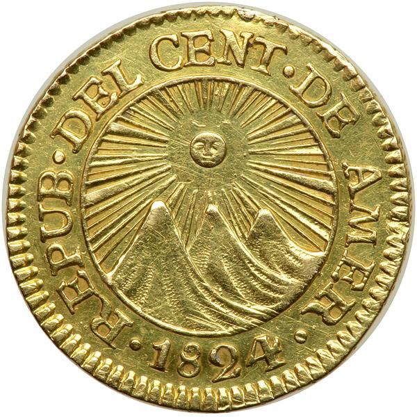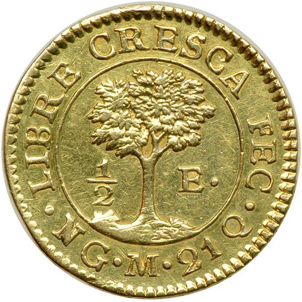 Guatemala. ½ Escudo, 1824-NG M. Fr-30; KM-5 (C.A.R) Sun over mountain peaks. Reverse: Tree. Trace of mount removed from edge. Extremely Fine.