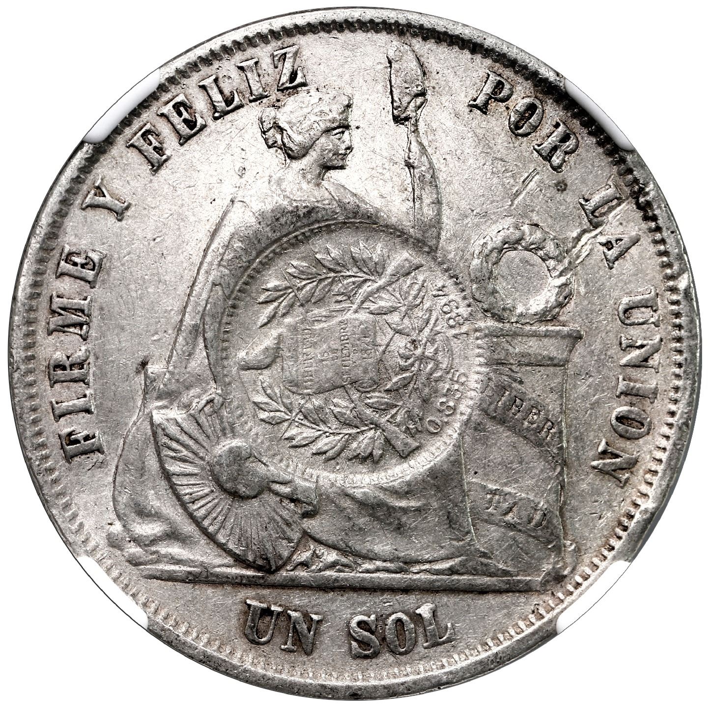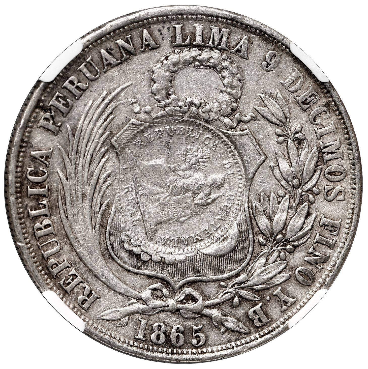Guatemala, 1 peso, "1/2 real" counterstamp of 1894 on a Lima, Peru, 1 sol, 1865 YB, NGC XF 45, c/s AU standard. KM-224. Early host date, no toning, minor flan-flaw inside LA of legend. Please use this link to verify the certification number