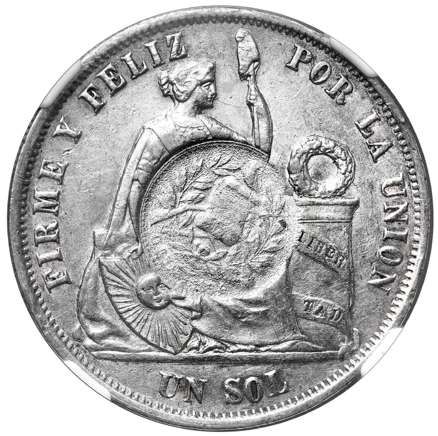 Guatemala, 1 peso,  1/2 real  counterstamp of 1894 on a Lima, Peru, 1 sol, 1866 YB, NGC AU 53, c/s A