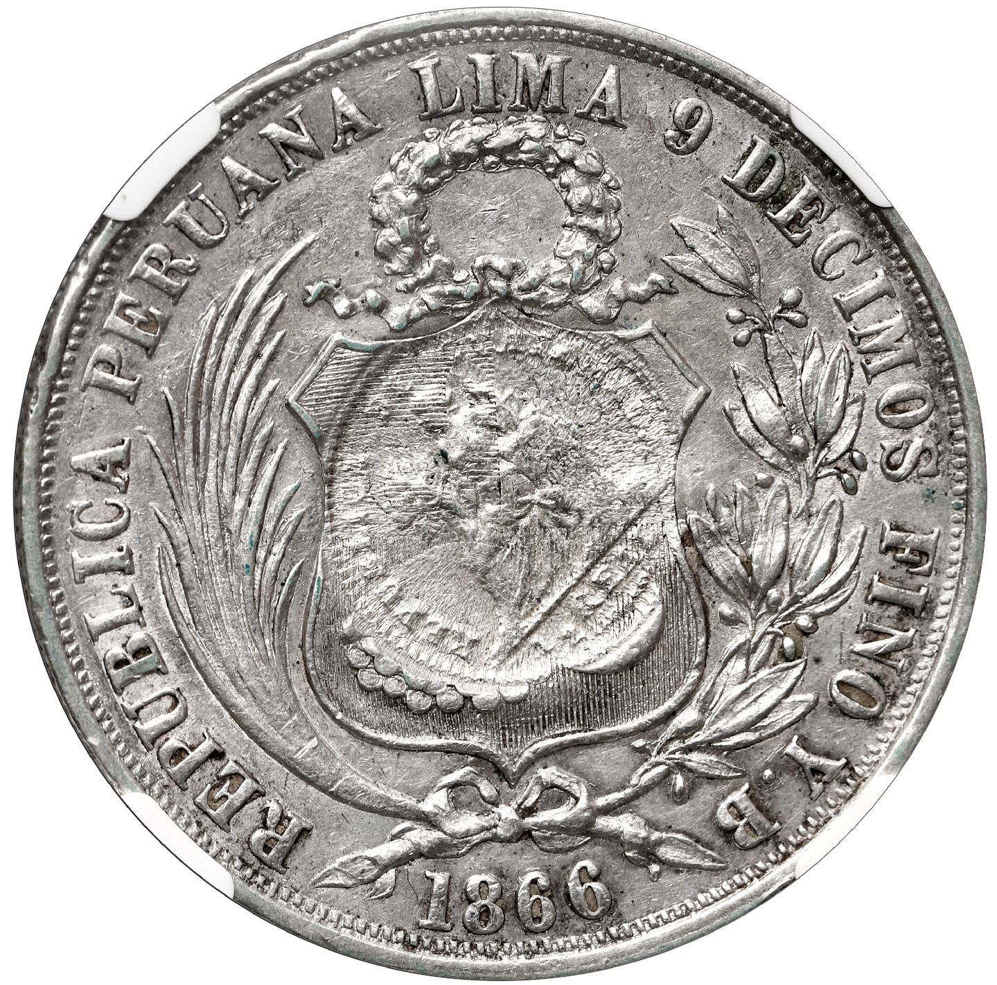Guatemala, 1 peso, "1/2 real" counterstamp of 1894 on a Lima, Peru, 1 sol, 1866 YB, NGC AU 53, c/s AU standard. KM-224. Minimal wear and faint luster (no toning), the full counterstamp slightly crude, early host date. Please use this link to verify the certification number