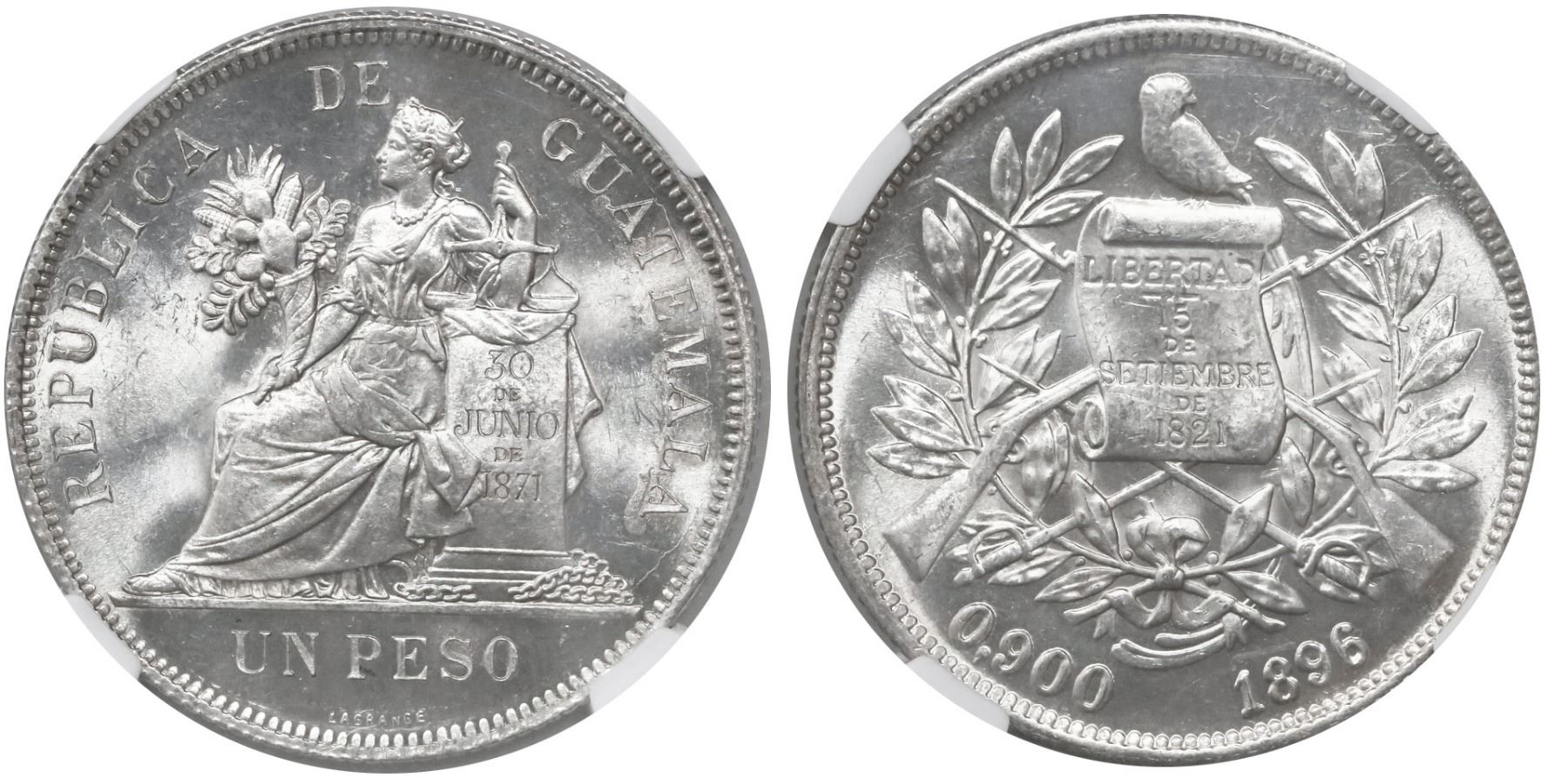 Guatemala, 1 peso, 1896, encapsulated NGC MS 63, ex-Richard Stuart (stated inside slab).
