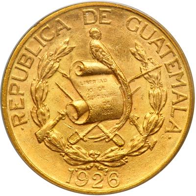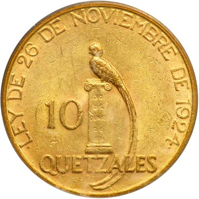 Guatemala. 10 Quetzales, 1926. Fr-49; KM-245. National arms. Reverse: Quetzal on column. PCGS graded AU-58.
