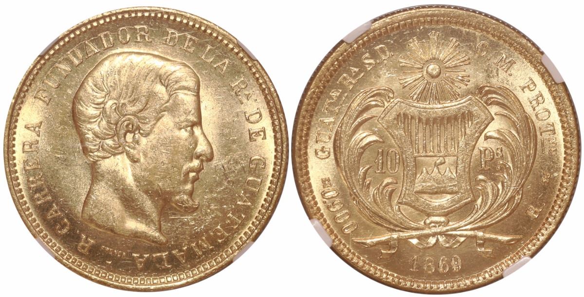 Guatemala, 10 pesos, 1869R, Carrera, encapsulated NGC MS 61.