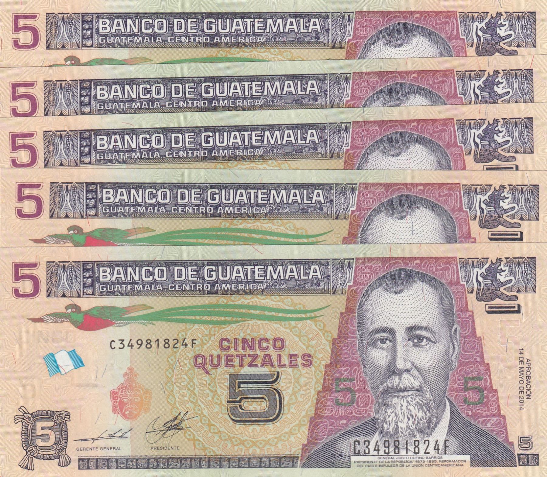 Guatemala, 5 Quetzales, 2014, UNC, pNew, (Total 5 banknotes)br/Some of the banknotes are serial follow-up in itself