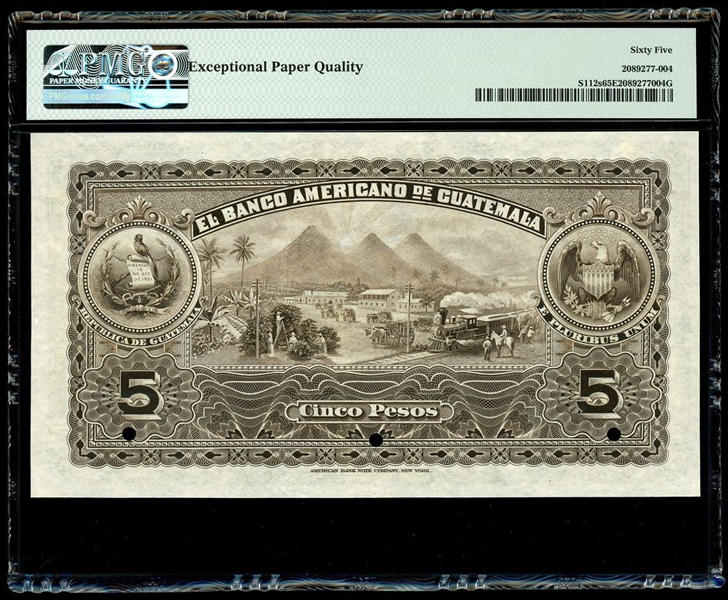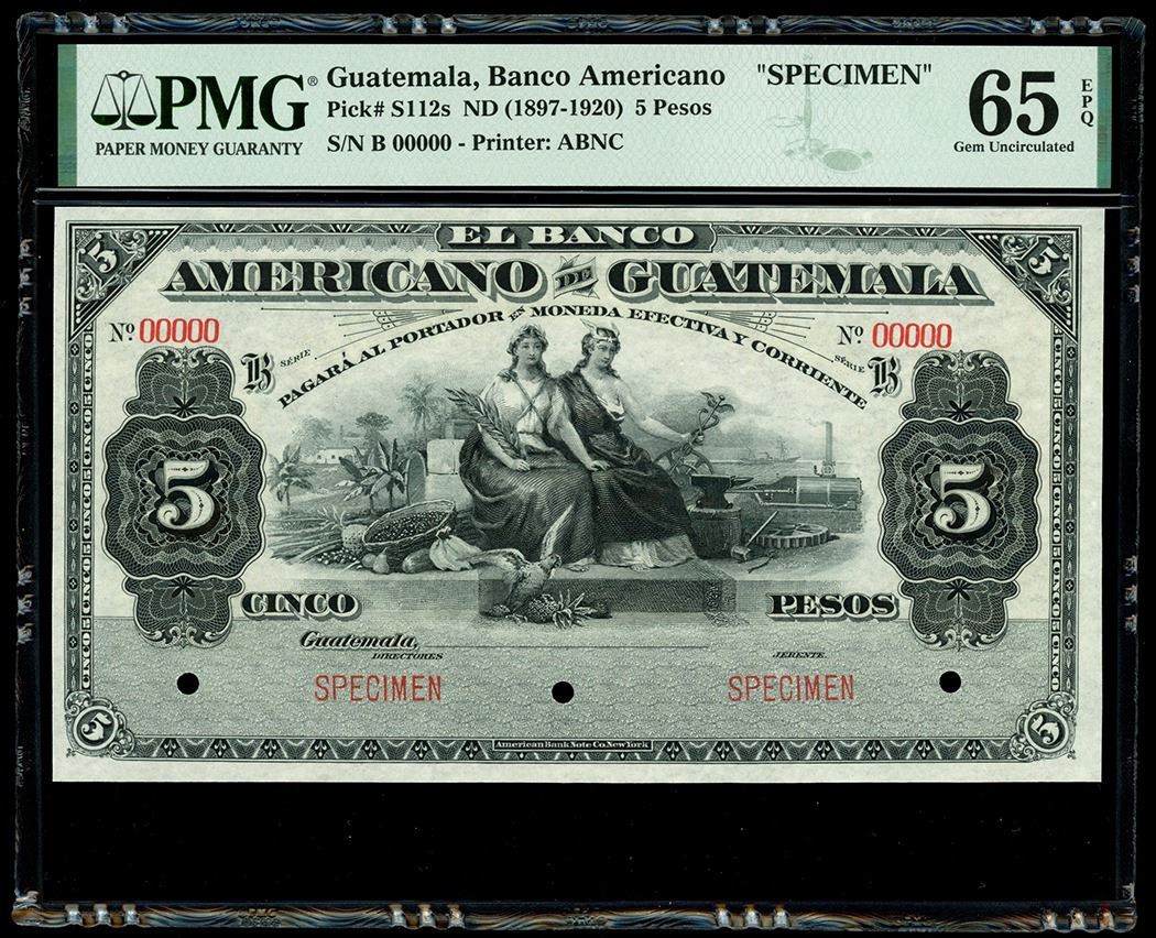 Guatemala, Banco Americano, 5 pesos specimen, series B, with red SPECIMEN overprint, PMG Gem UNC 65 EPQ. Pick-S112s. High-grade example of this beautiful and large Guatemala specialized type note, only one finer in the PMG census. The two arms vignettes on the reverse, Guatemala's at left and that of the United States at right, illustrate the extensive American business control on Guatemala's economy at the time. Please use this link to verify the certification number