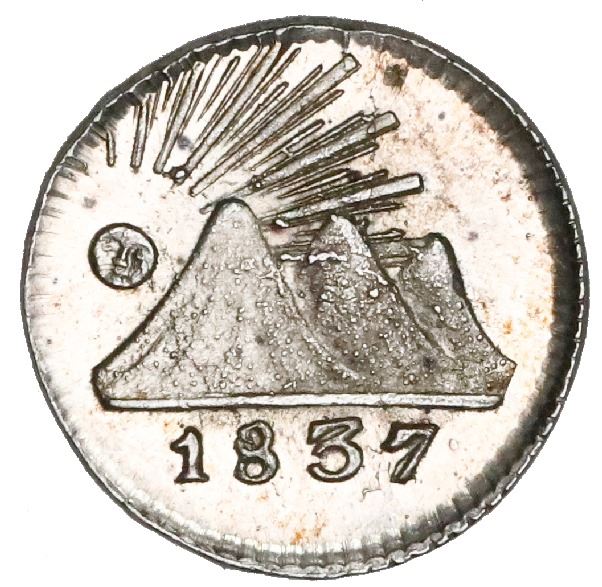 Guatemala (Central American Republic), 1/4 real, 1837, NGC MS 65. KM-1. 0.78 gram. Choice full strike with brilliant mint luster, no toning, just a touch of die rust that does not visually detract but precludes the MS 66 to 68 grades this hoard date can achieve. NGC #5938553-002.